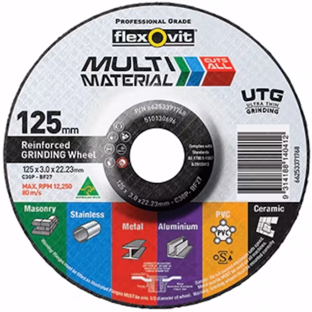 Home » Shop » CUTTING TOOLS (HSS & Carbide) » ABRASIVES » MULTI MATERIAL DEPRESSED CENTRE ULTRA THIN GRINDING » FLEXOVIT 115 x 3.0 x 22.23mm C30/2P ULTRA THIN MULTI MATERIAL DEPRESSED CENTRE GRINDING