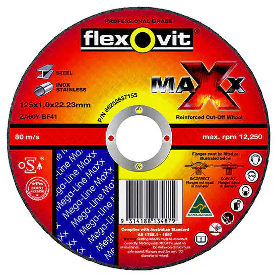 FLEXOVIT® MAXX Cut Off Discs are an ultra-thin, premium grade cutting abrasive suitable for Ultra-thin cutting of stainless steel, alloy steels and hard ferrous metals. MAXX Cut Off Discs utilise Zirconia grain which improves cutting life on harder materials.