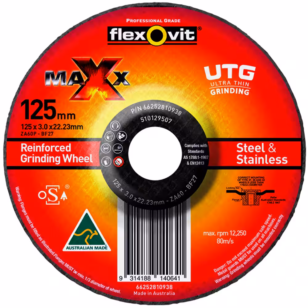 Home » Shop » CUTTING TOOLS (HSS & Carbide) » ABRASIVES » MAXX DEPRESSED CENTRE ULTRA THIN GRINDING » FLEXOVIT 125 x 3.0 x 22.23mm ZA60P-T27 MAXX ULTRA THIN DEPRESSED CENTRE GRINDING