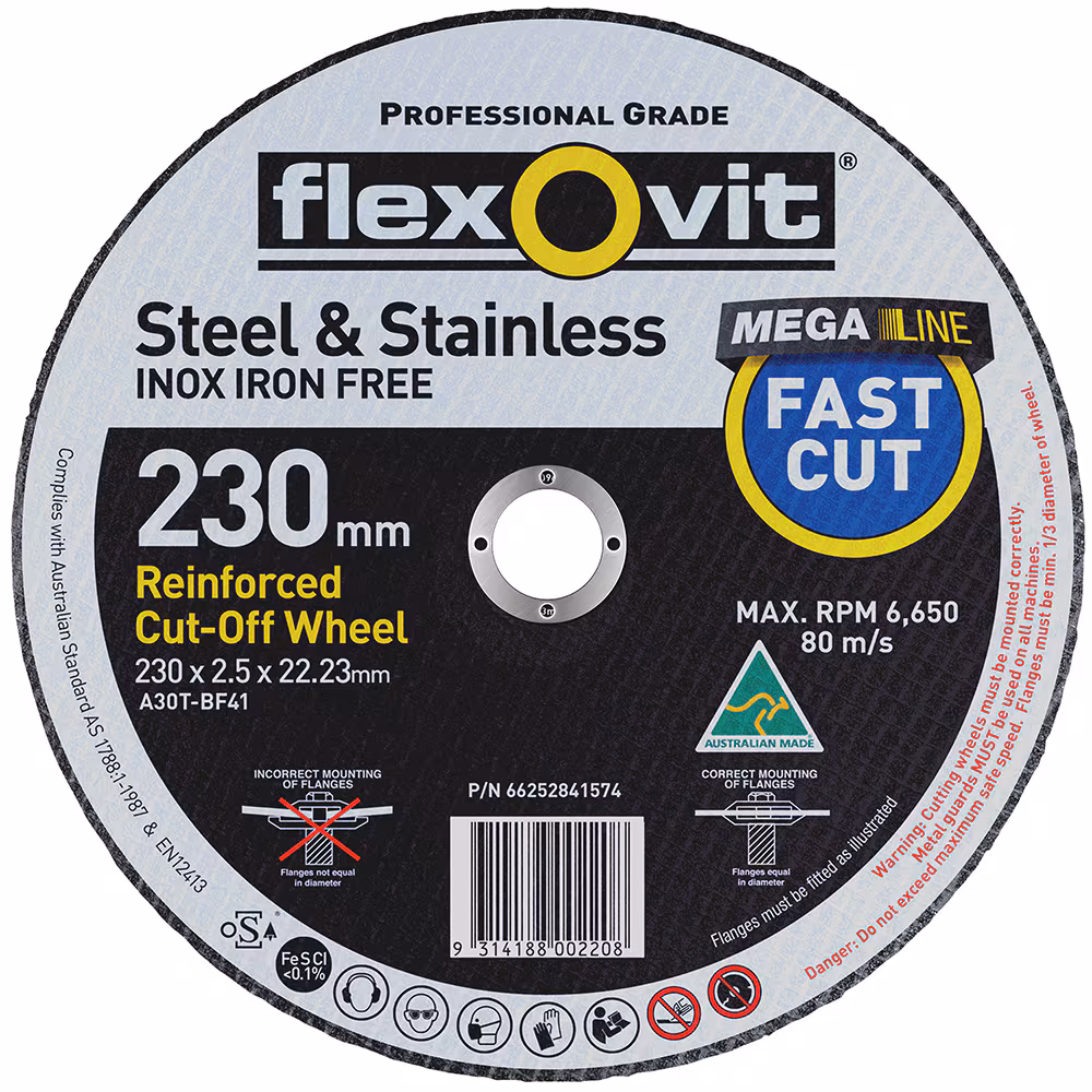Home » Shop » CUTTING TOOLS (HSS & Carbide) » ABRASIVES » MEGA-LINE » FLEXOVIT 230 x 2.5 x 22.23mm FLX-MEGA-LINE