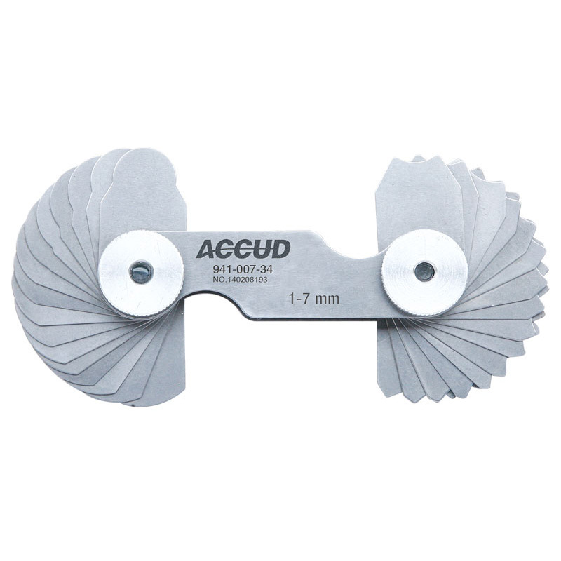 • Check the radius • Concave and convex surface in each leaf Range: 1-7 mm Accuracy: ±0.03 mm Quantity: 17×2 Gradations: 1, 1.25, 1.5, 1.75, 2, 2.25, 2.5, 2.75, 3, 3.5, 4, 4.5, 5, 5.5, 6, 6.5 & 7