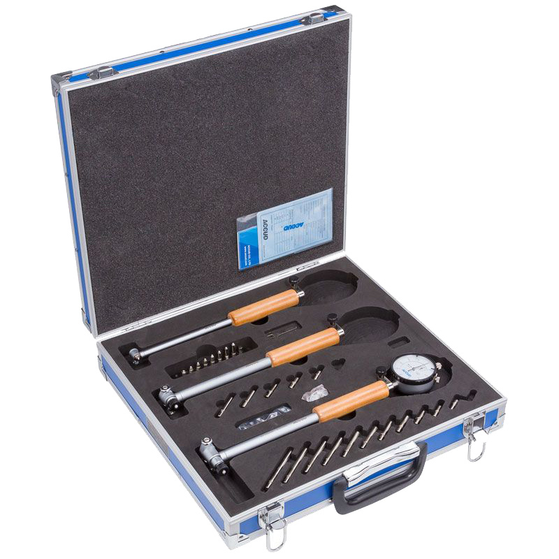 • Wooden handle isolate heat conduction • Optional accessory: series 531 setting • rings Range: 18-160mm Indicating range: 10 mm Graduations: 0.01 mm Accuracy: 18-35mm / ±0.015 mm 35-60mm / ±0.018 mm 50-160mm / ±0.018 mm Repeatability: 0.003 mm Bore gages included: 35-50mm anvil (dial indicator and handle are not included) 50-160mm bore gage