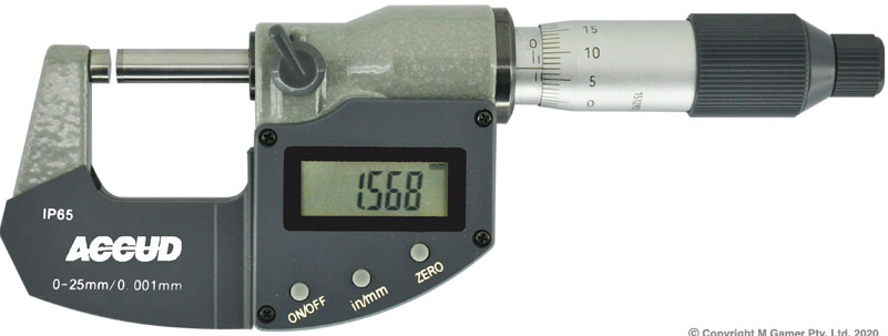 • Absolute system • IP65 protection level • Functions: origin, mm/inch, zero point, ABS, hold, data export • Date output • Carbide measuring faces • Ratchet stop • Setting standards are included Range: 75-100mm/3-4″ Resolution: 0.001mm/0.00005″ Accuracy: ±3µm External Jaw Reach: 57mm