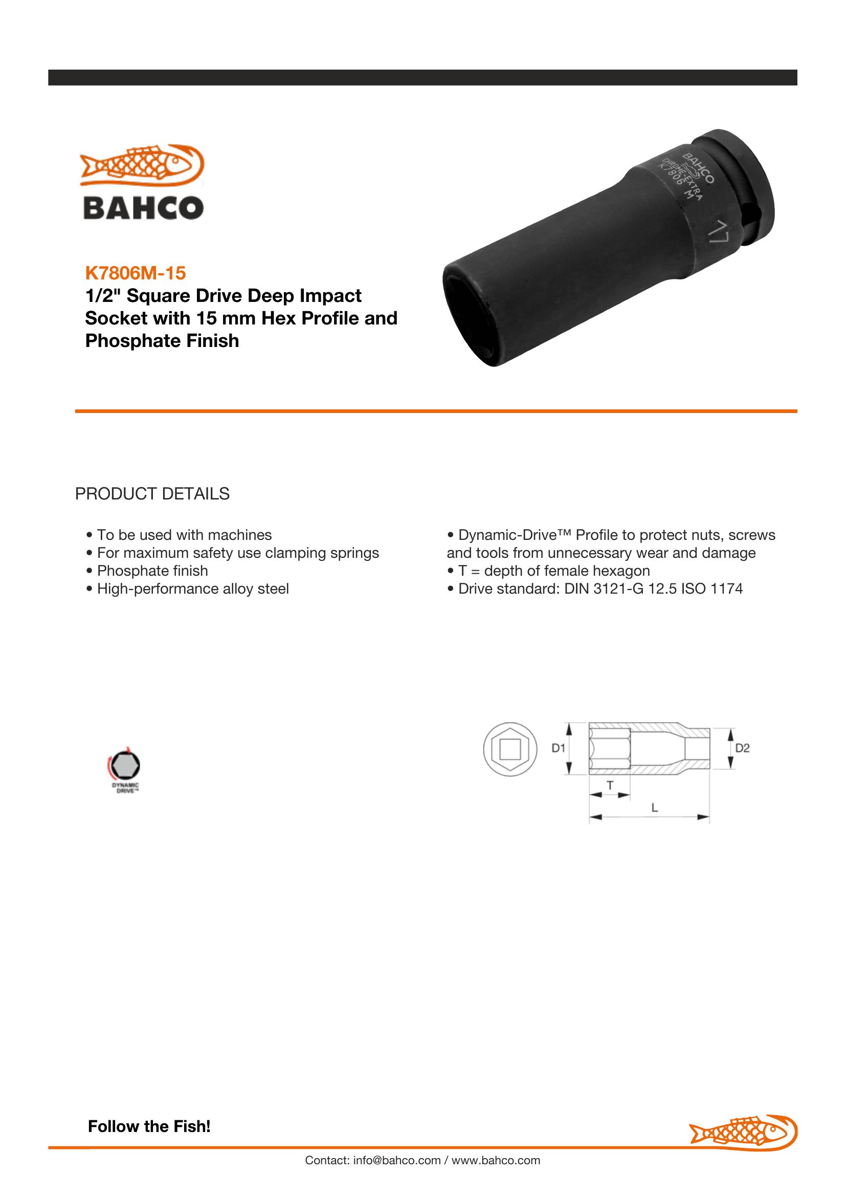Bahco 1/2″ Square Drive Deep Impact Socket with 15 mm Hex Profile and Phosphate Finish