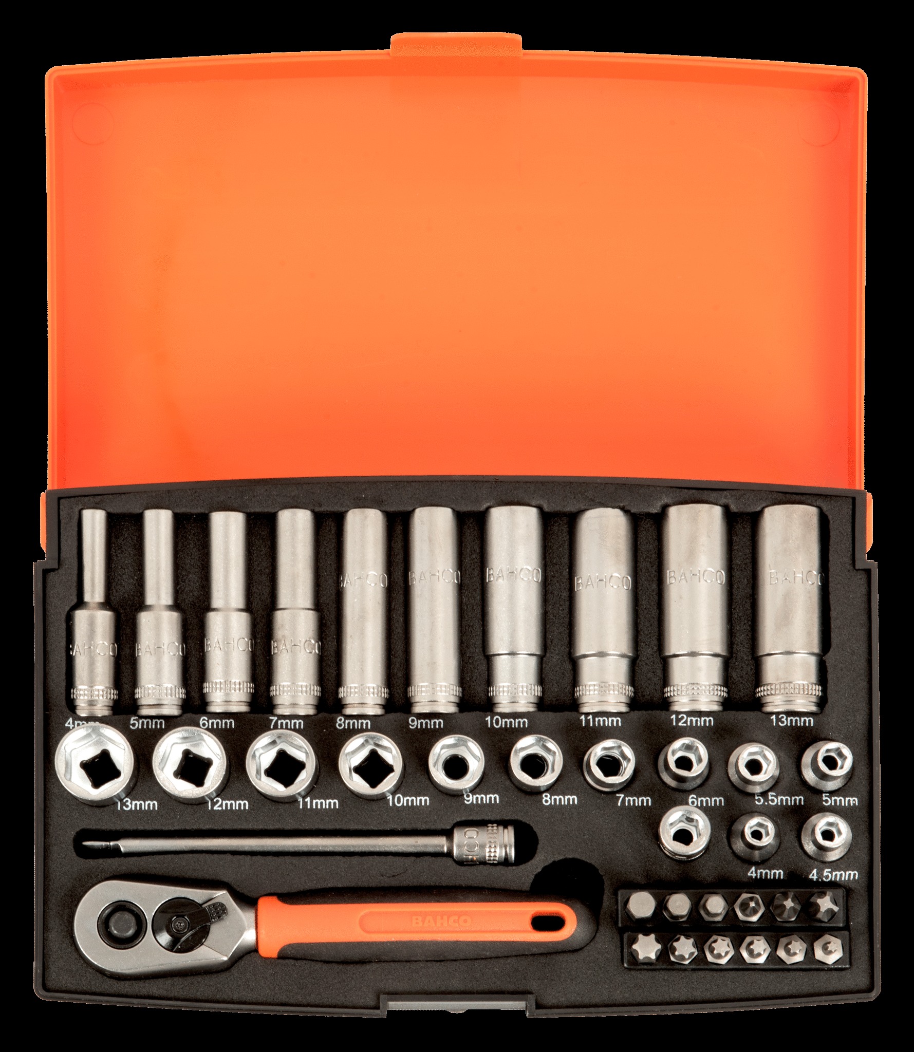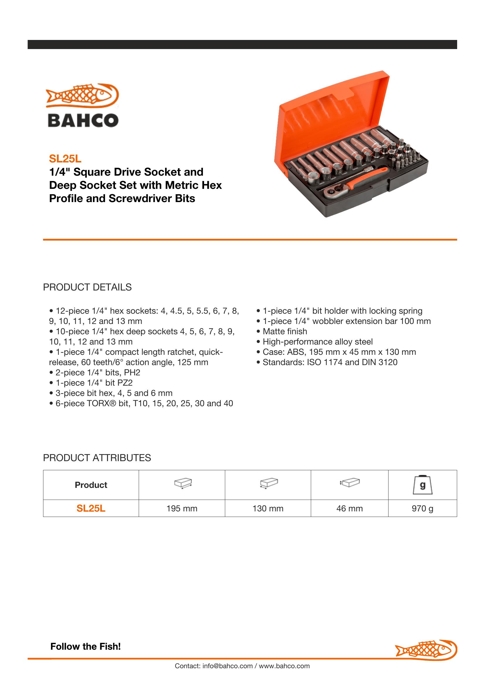 12-piece 1/4″ hex sockets: 4, 4.5, 5, 5.5, 6, 7, 8, 9, 10, 11, 12 and 13 mm