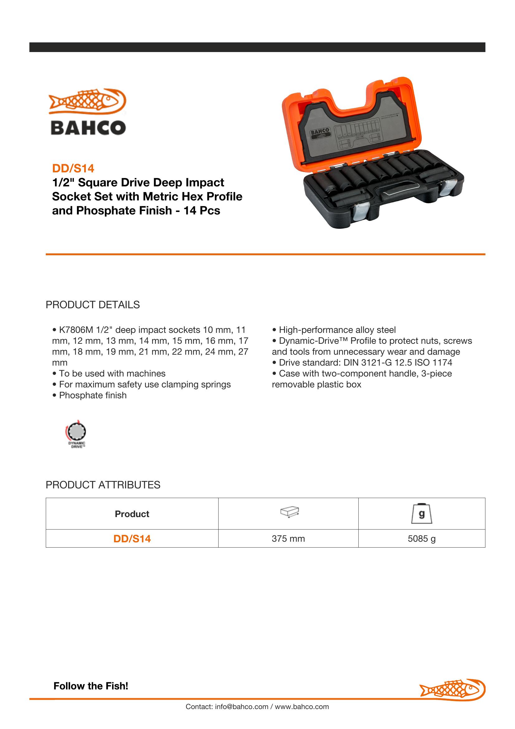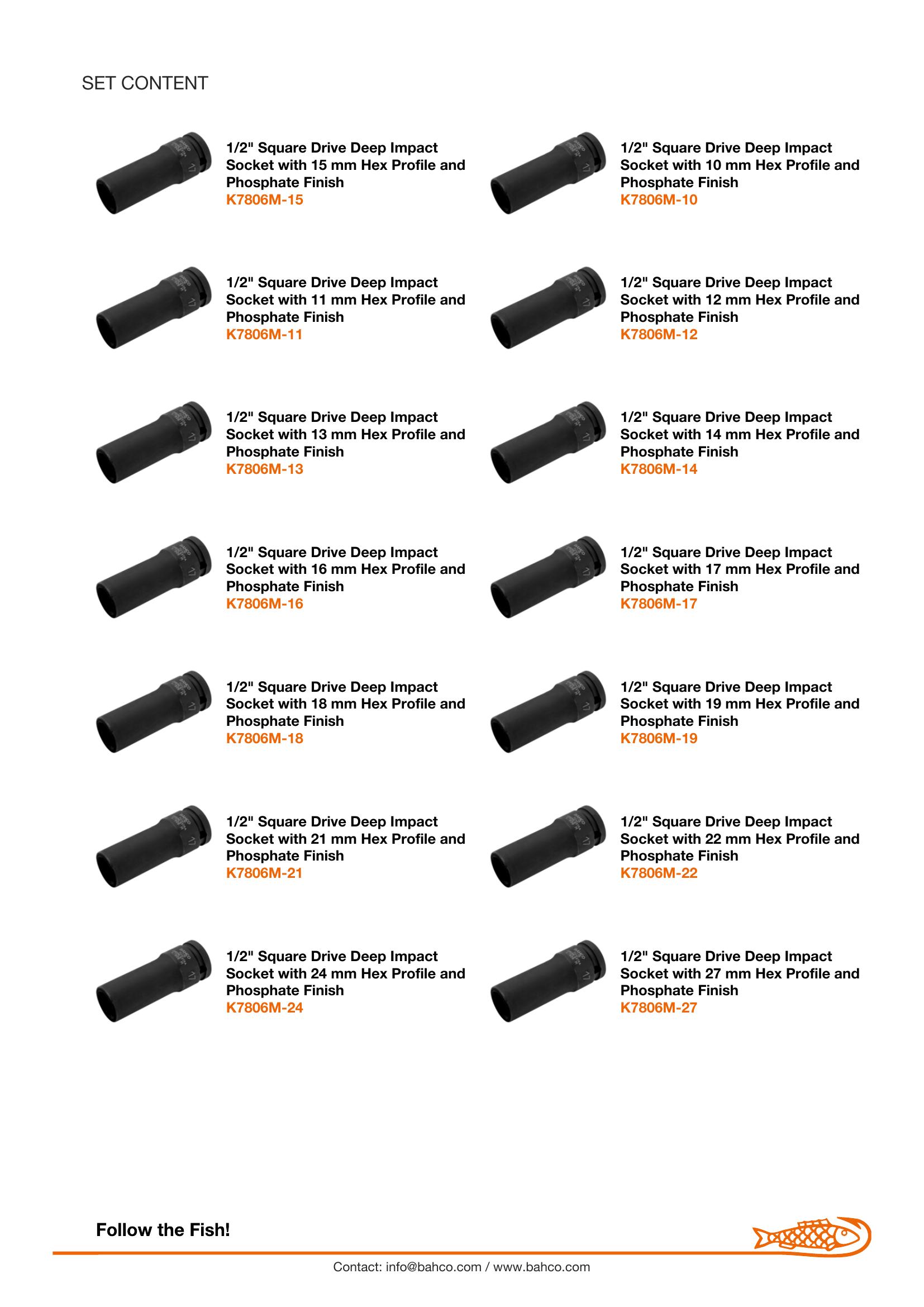 K7806M 1/2″ deep impact sockets 10 mm, 11 mm, 12 mm, 13 mm, 14 mm, 15 mm, 16 mm, 17 mm, 18 mm, 19 mm, 21 mm, 22 mm, 24 mm, 27 mm