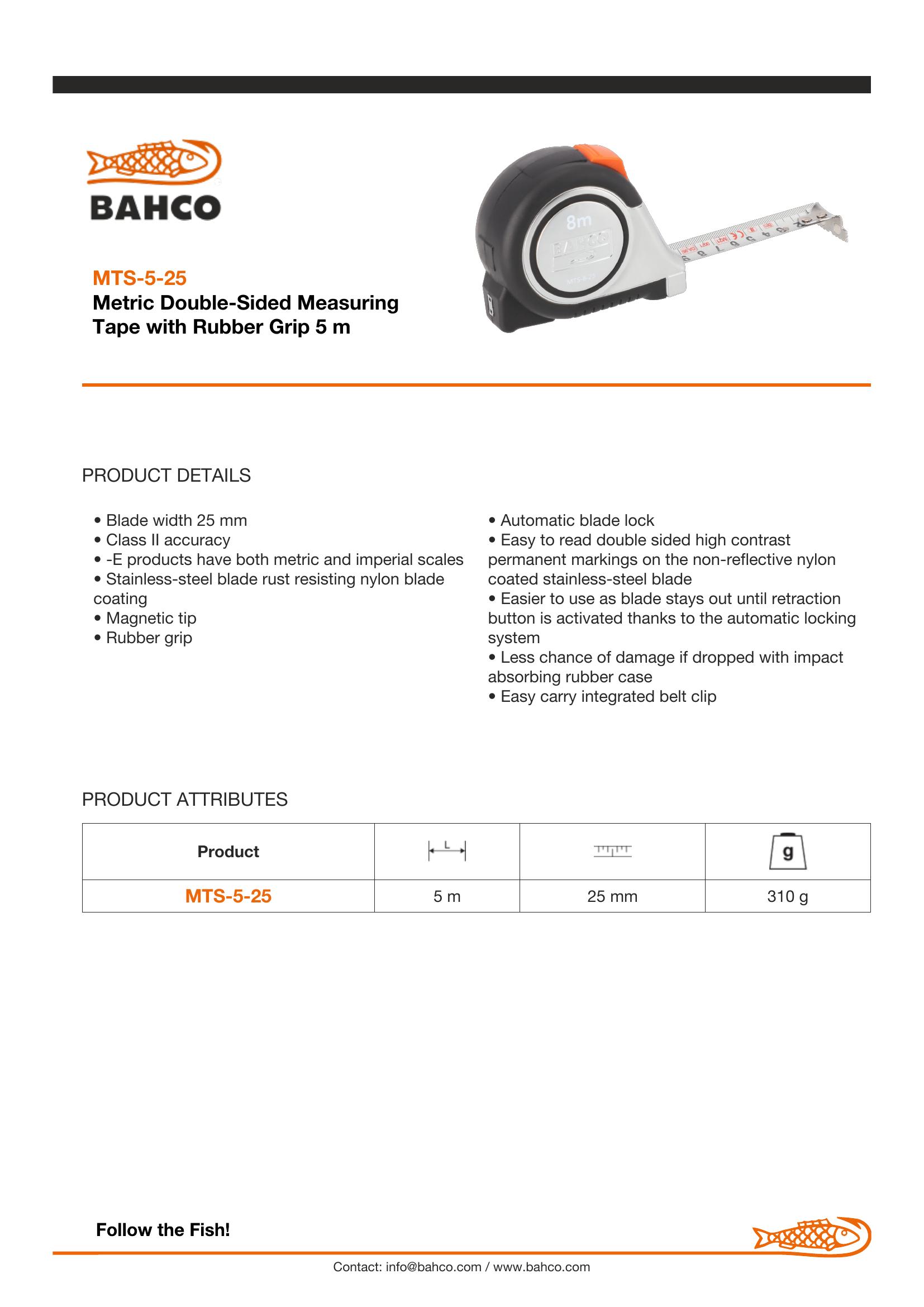 Bahco 5 metre, measuring tape, stainless steel blade, blade width 25mm
