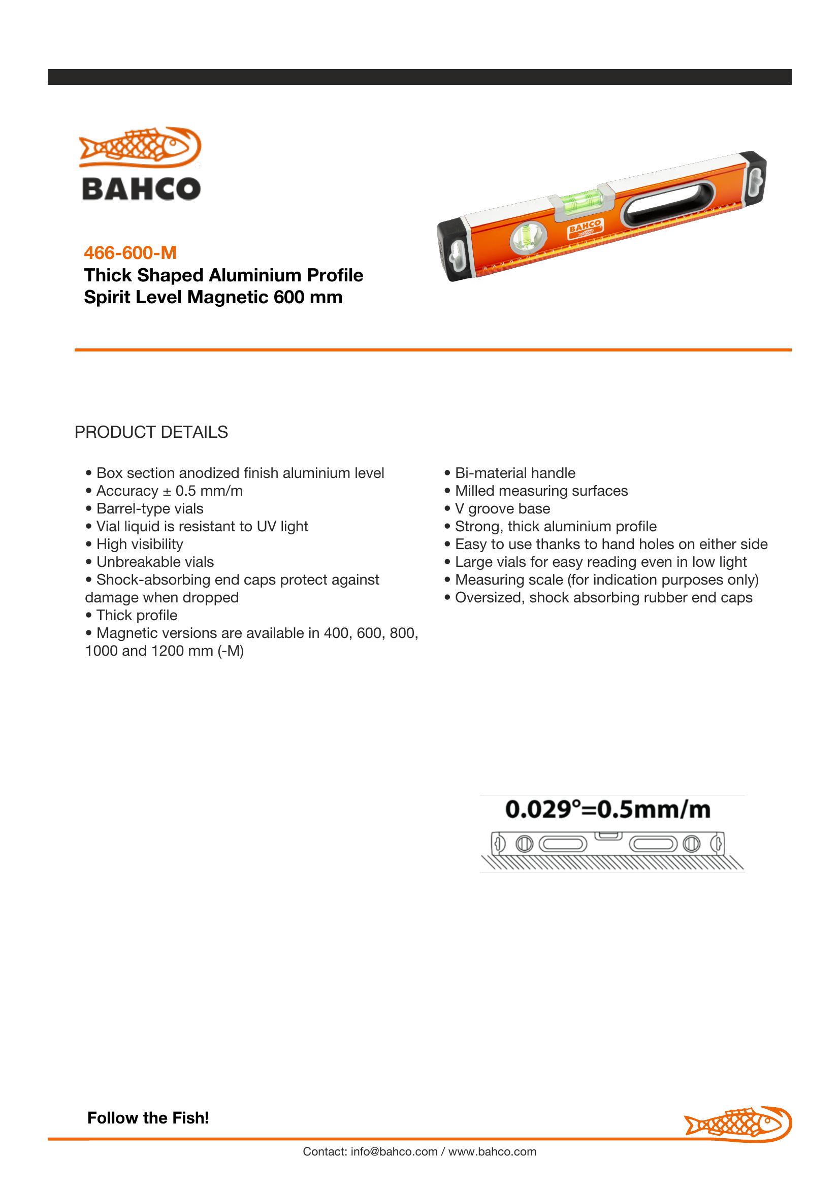 Bahco Box Spirit Level, 600mm rigid, 2 vertical plumb vials, 1 horizontal vial – Magnetic