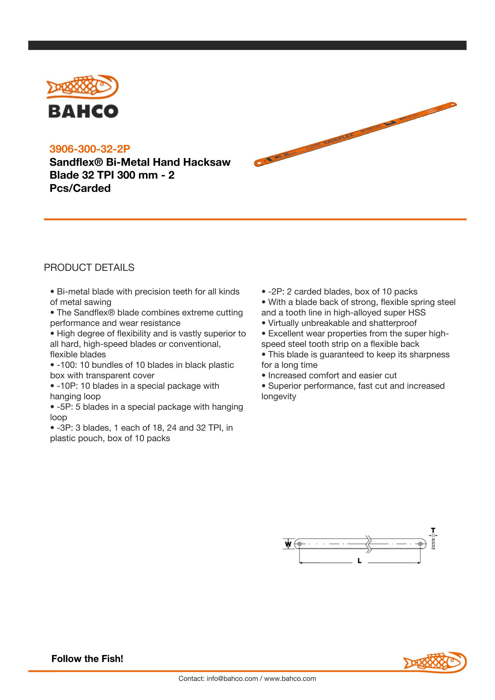 Bahco Hacksaw blades, 300mm, 32 TPI Sandflex flexible bi-metal HSS, 2 blades per card