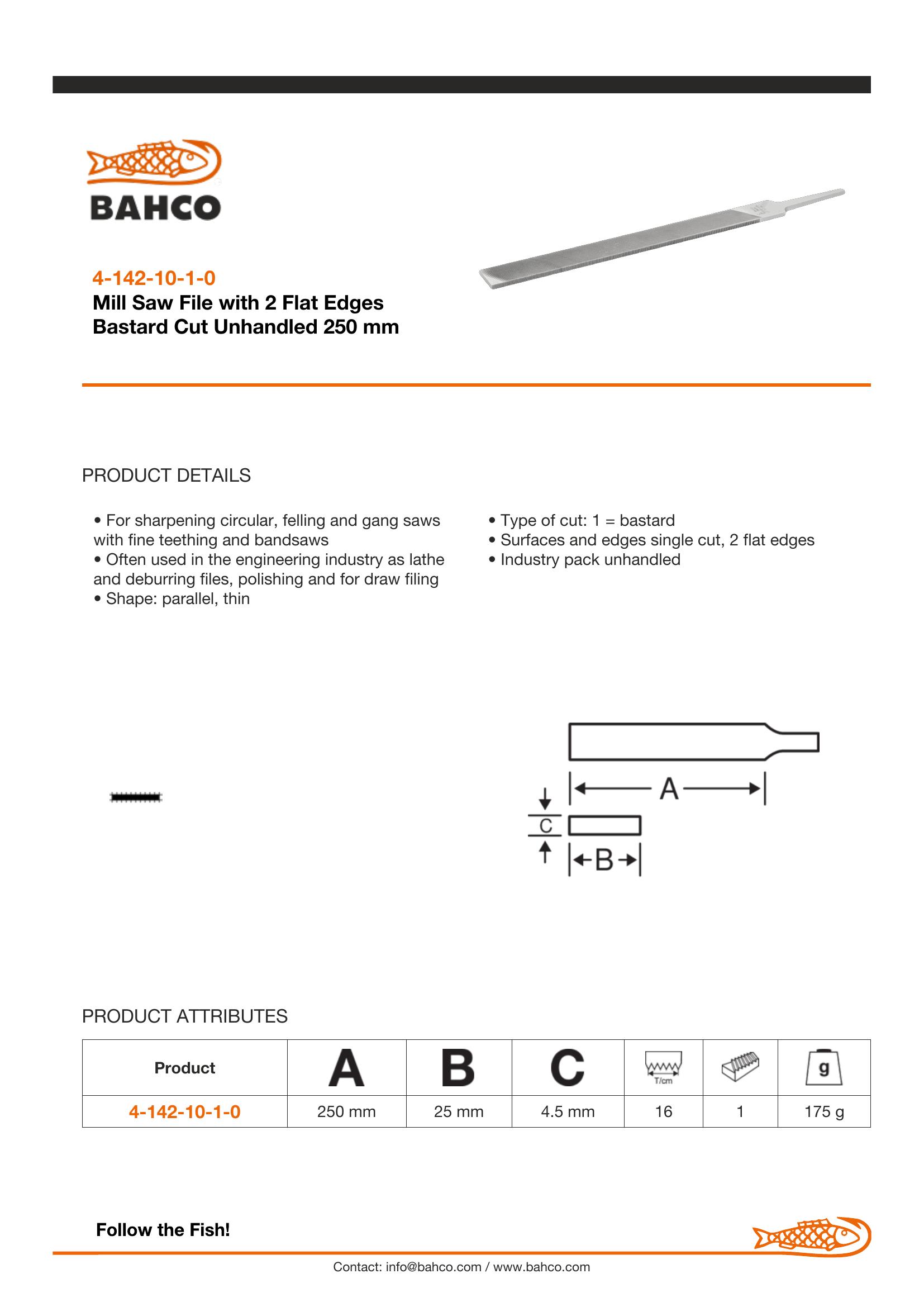 Bahco Mill saw file, 10″, 25cm, 2SQE bastard cut, no handle, industrial pack