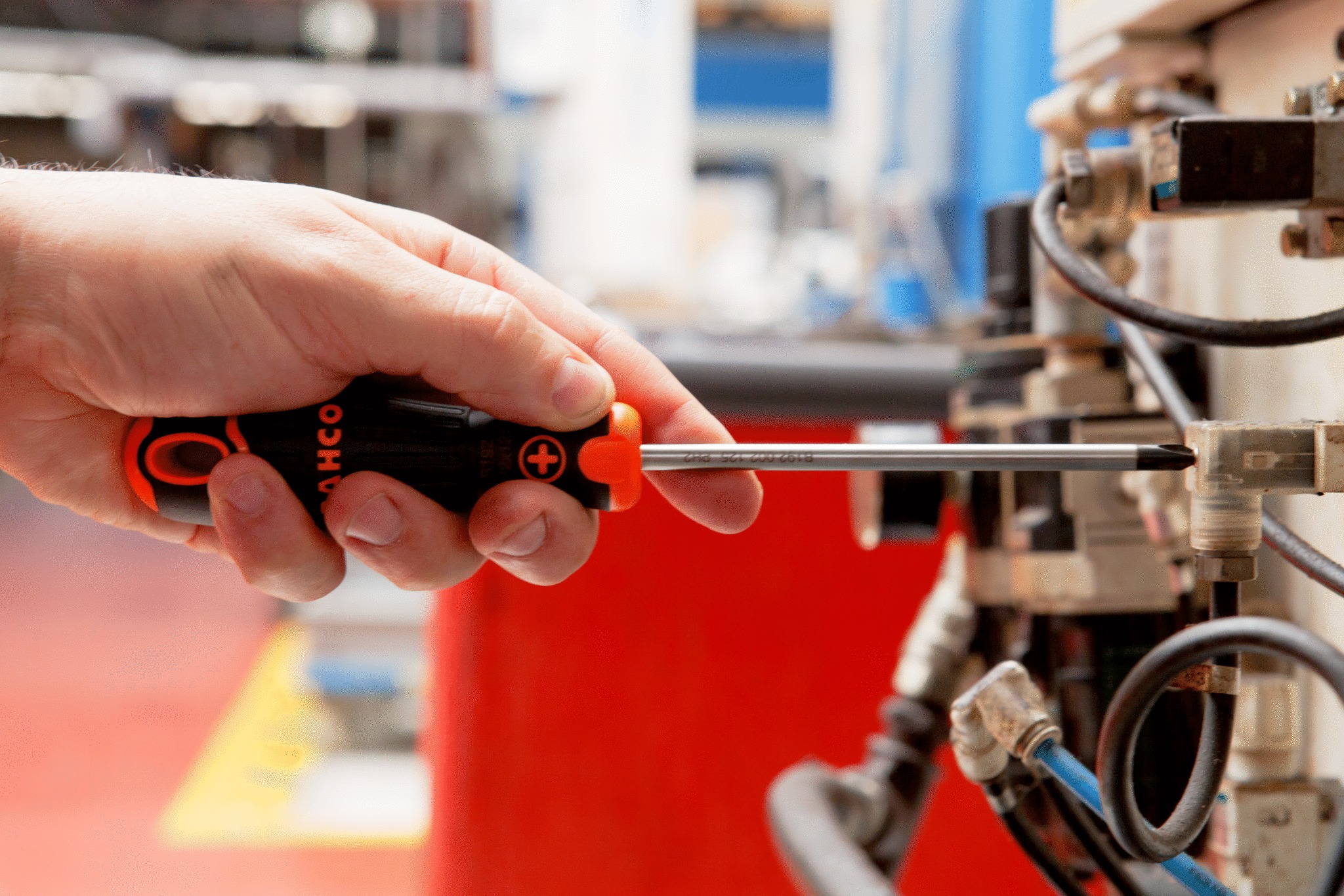 Two-component handle with vertical grooves for comfortable grip and maximum force transmission