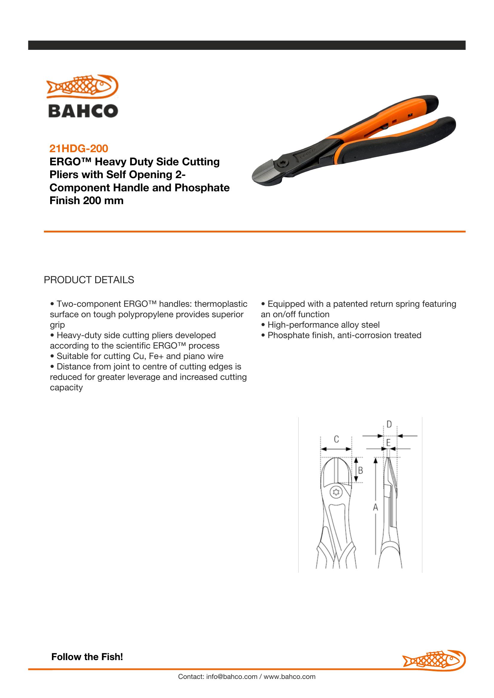 Bahco Pliers, ERGO, Side Cutting – Heavy Duty cutting capacity up to 3.0mm of piano wire