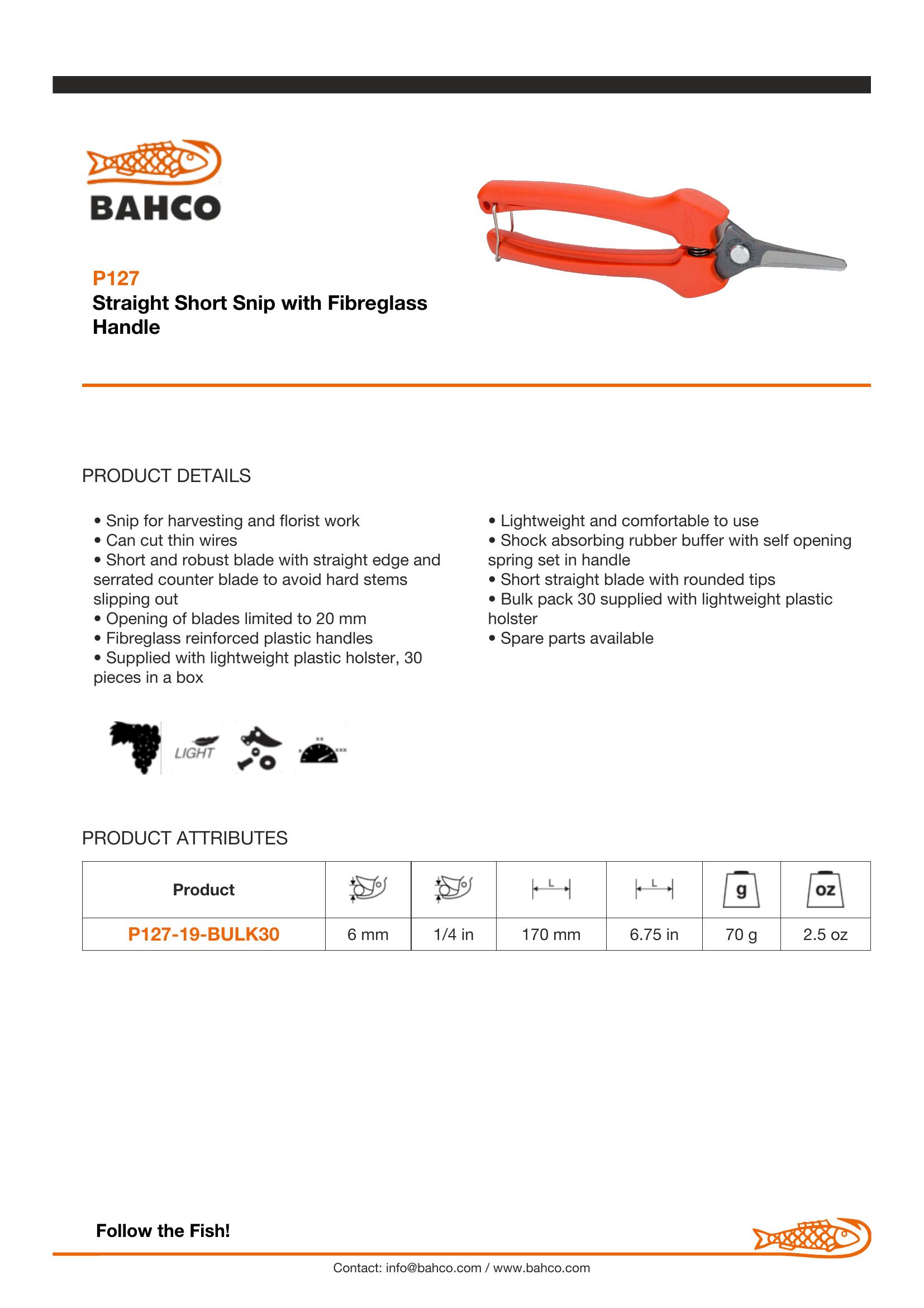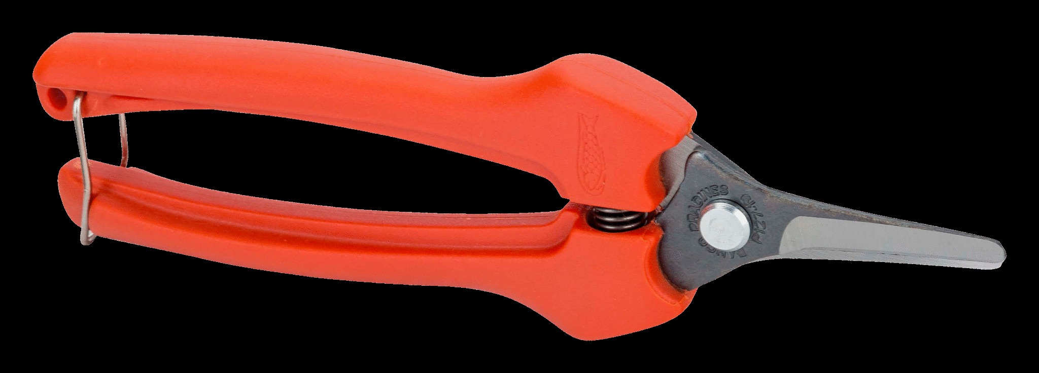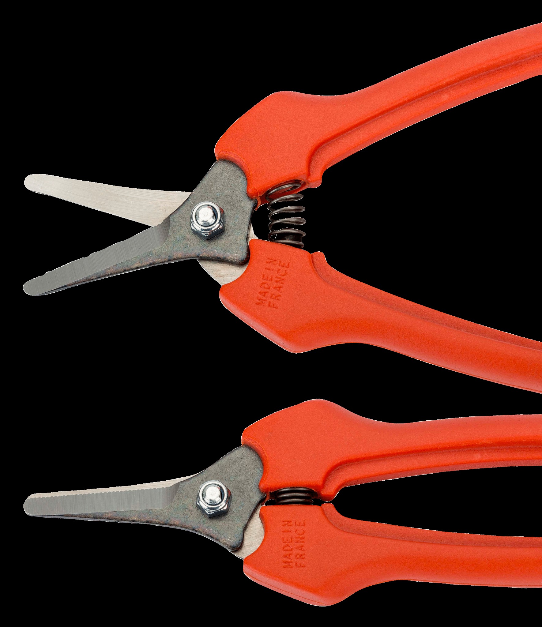 Short and robust blade with straight edge and serrated counter blade to avoid hard stems slipping out