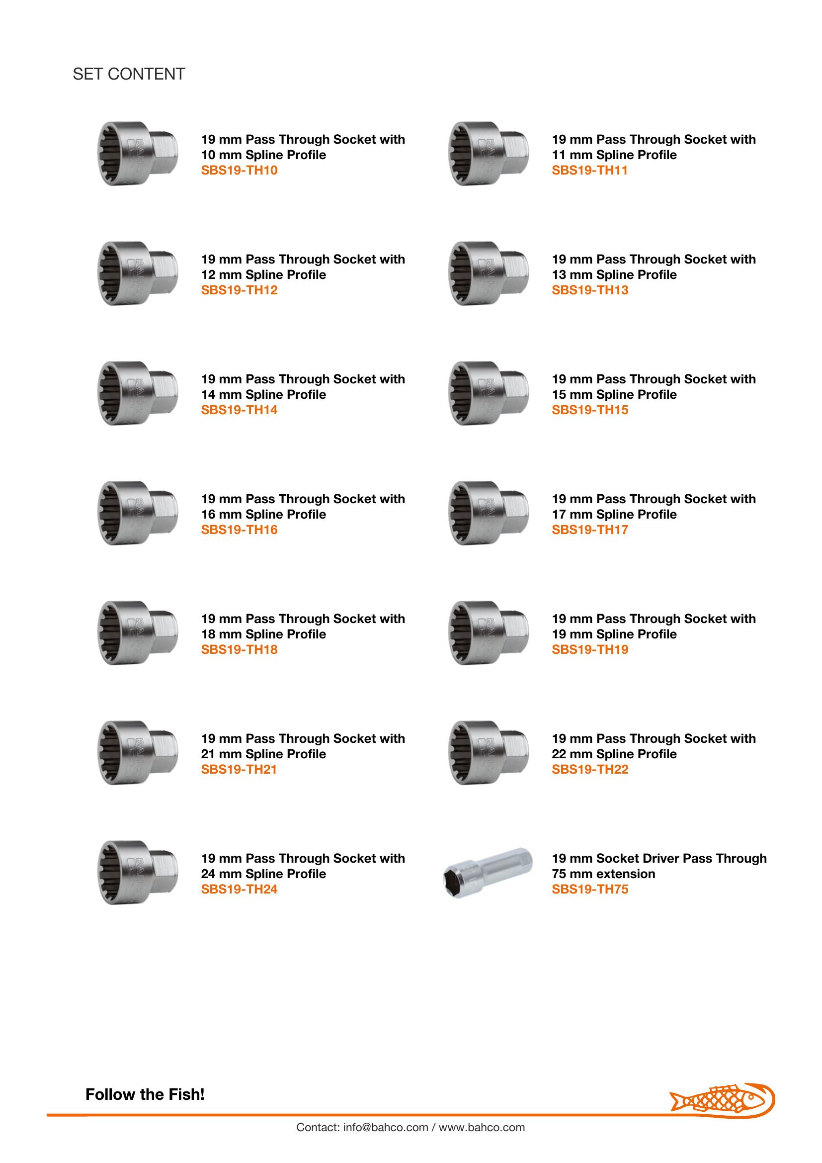 12-Piece pass-through sockets: 10, 11, 12, 13, 14, 15, 16, 17, 19, 21, 22 and 24 mm