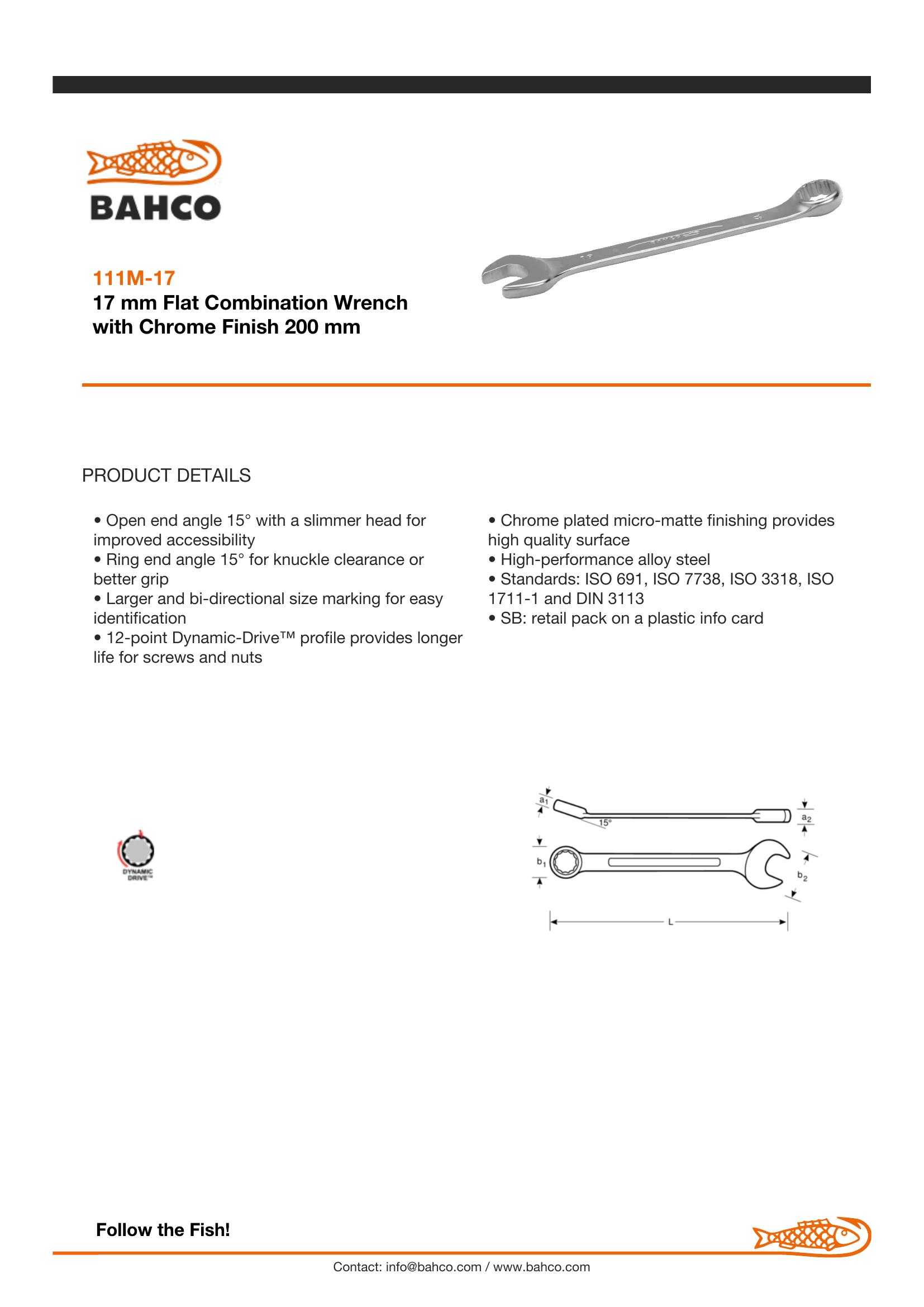 Bahco Spanner, Metric, Combination Ring & Open End, 17mm, Vanadium-Extra Chrome Plated, Open End Angle 15 Deg. – Ring 15 Deg. Offset