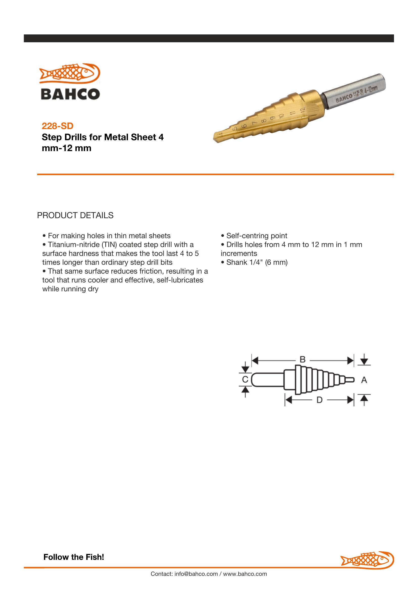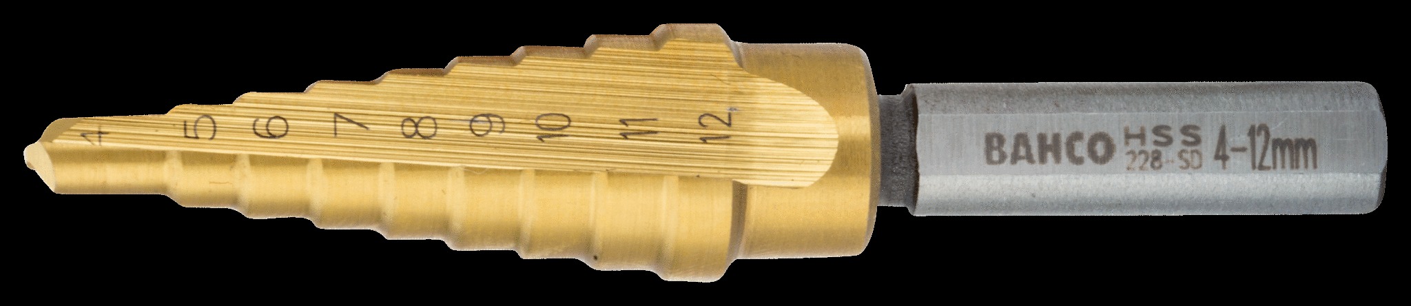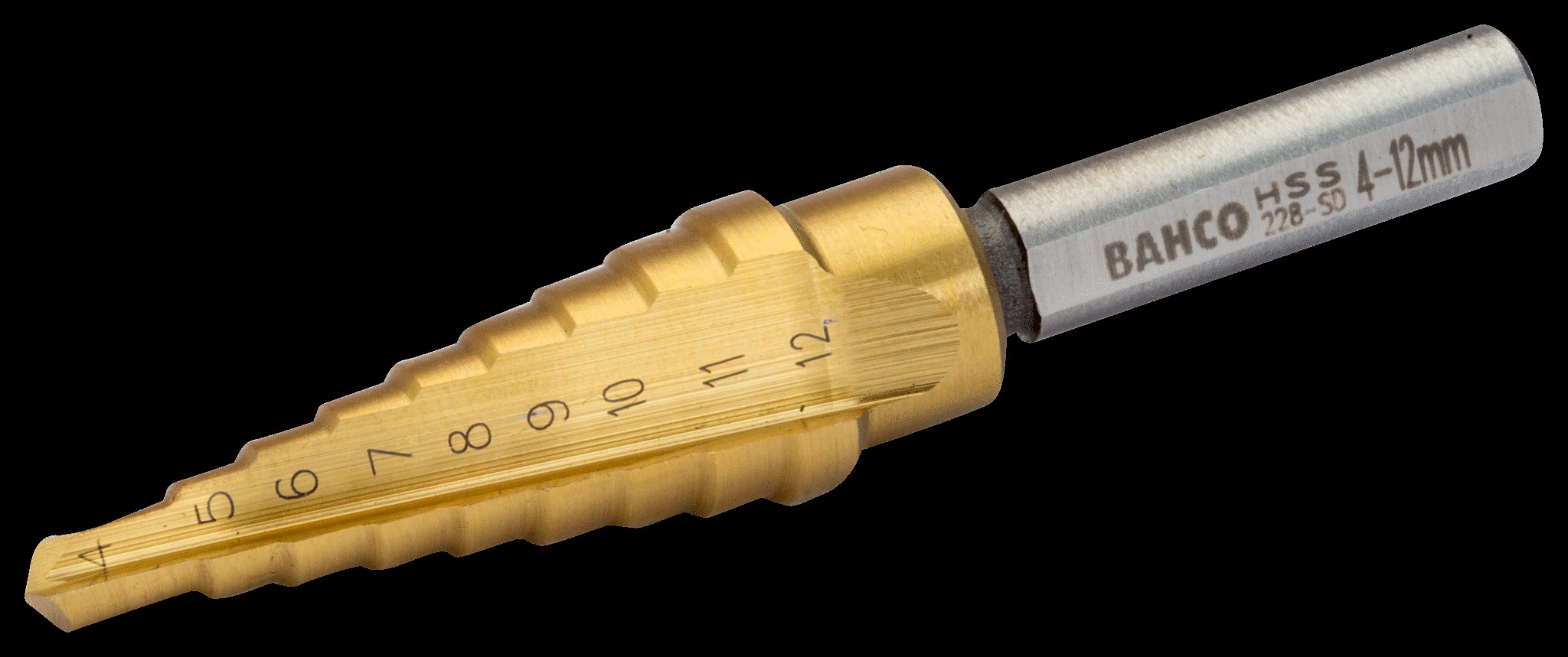 Titanium-nitride (TIN) coated step drill with a surface hardness that makes the tool last 4 to 5 times longer than ordinary step drill bits