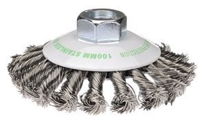 Twist knot bevel brushes are designed for use with electric or pneumatic high speed grinders for heavy duty cleaning of hard to reach areas including internal edges and corners.