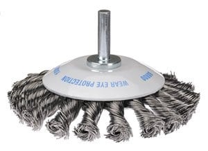 Twist knot bevel brushes are designed for use with electric or pneumatic high speed grinders for heavy duty cleaning of hard to reach areas including internal edges and corners.