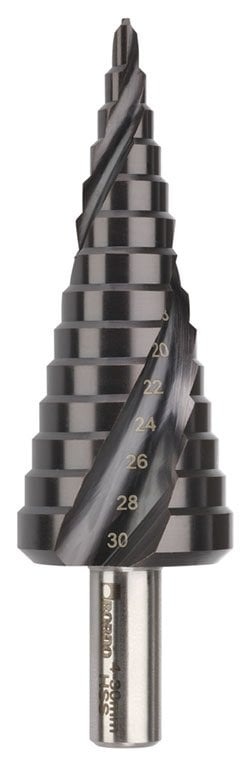 Bordo step drills are ideal for electrical contractors, sheetmetal workers and auto mechanics. Step drills are designed for drilling repetitive holes in steel, stainless steel, copper, brass, aluminium, plastic, plexiglas, laminates and many other thin materials. High performance point for faster starting and reduced bit wander.