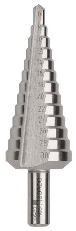 Bordo step drills are ideal for electrical contractors, sheetmetal workers and auto mechanics. Step drills are designed for drilling repetitive holes in steel, stainless steel, copper, brass, aluminium, plastic, plexiglas, laminates and many other thin materials. Manufactured from premium quality high speed steel with double fluted ground cutting edges for long service life.