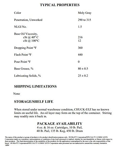 CHUCK-EEZ® High percentage of molybdenum disulfide, black moly grease used to reduce seizing, galling, fretting wear and to prevent reduced friction under conditions of extreme pressure a power chuck lubricant is formulated to reduce: