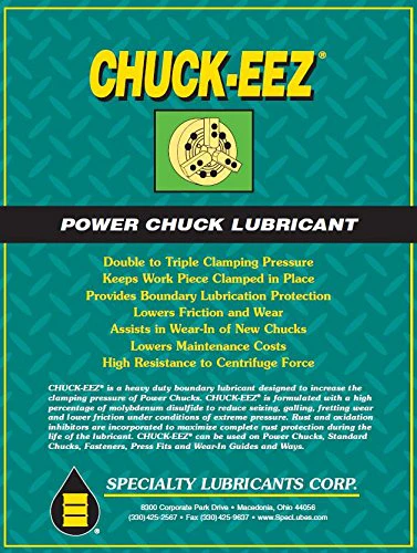 The tacky nature of CHUCK-EEZ give it high resistance to centrifuge force. Rust and oxidation inhibitors are incorporated to maximize complete rust protection during the life of the lubricant. CHUCK-EEZ may also be used as an anti-seize lubricant on the fasteners with assembling the chuck.