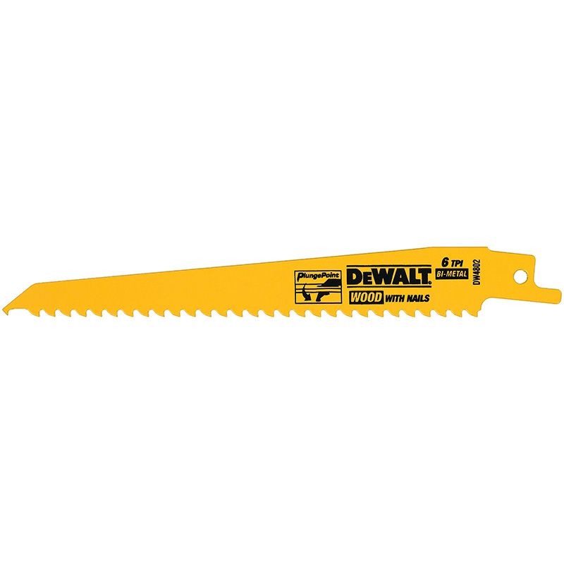 With a 6-degree hook angle for fast, aggressive cuts, DEWALT Wood Cutting Reciprocating Saw Blades feature a reinforced tooth for additional strength when cutting through nails and other foreign objects. Raker tooth design helps to increase contact area for fast cuts. A specially formulated anti-stick coating minimises friction and gum-up.