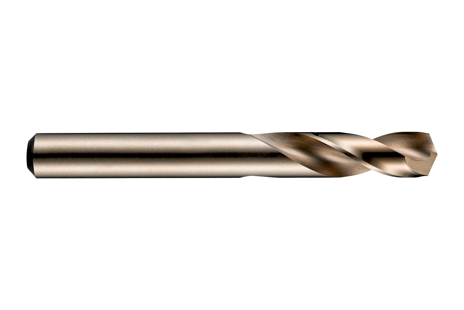 Stub length drill with straight shank, diameter 4.9mm with an overall length of 62mm and flute length of 26mm according to DIN 1897 standard with 135° split point, cobalt based HSS-E with bronze finish for 2.5xD drilling without pecking in stainless steel and super-alloy