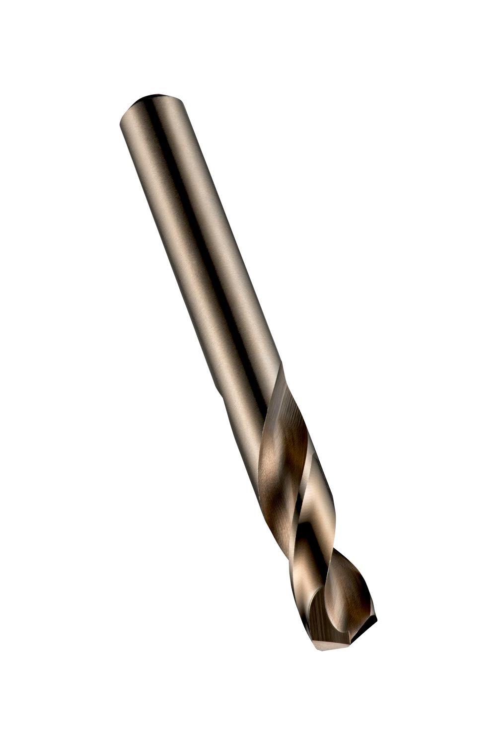 Stub length drill with straight shank, diameter 8.8mm with an overall length of 84mm and flute length of 40mm according to DIN 1897 standard with 135° split point, cobalt based HSS-E with bronze finish for 2.5xD drilling without pecking in stainless steel and super-alloy