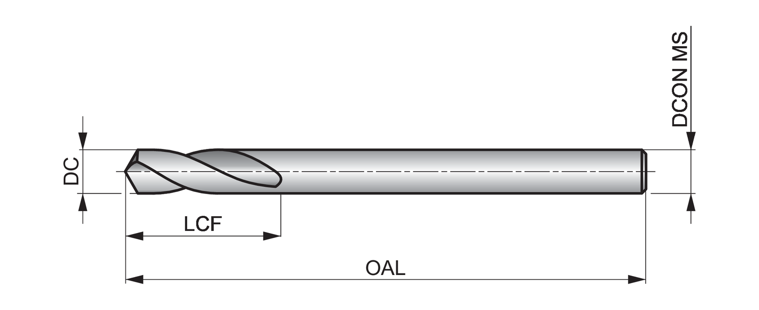Sheet metal drill with straight shank, diameter 0.2500″ (1/4S) with an overall length of 70mm and flute length of 19mm according to DIN 1897 standard with 120° point angle, HSS with steam tempered finish for 1.5xD drilling without pecking in steel