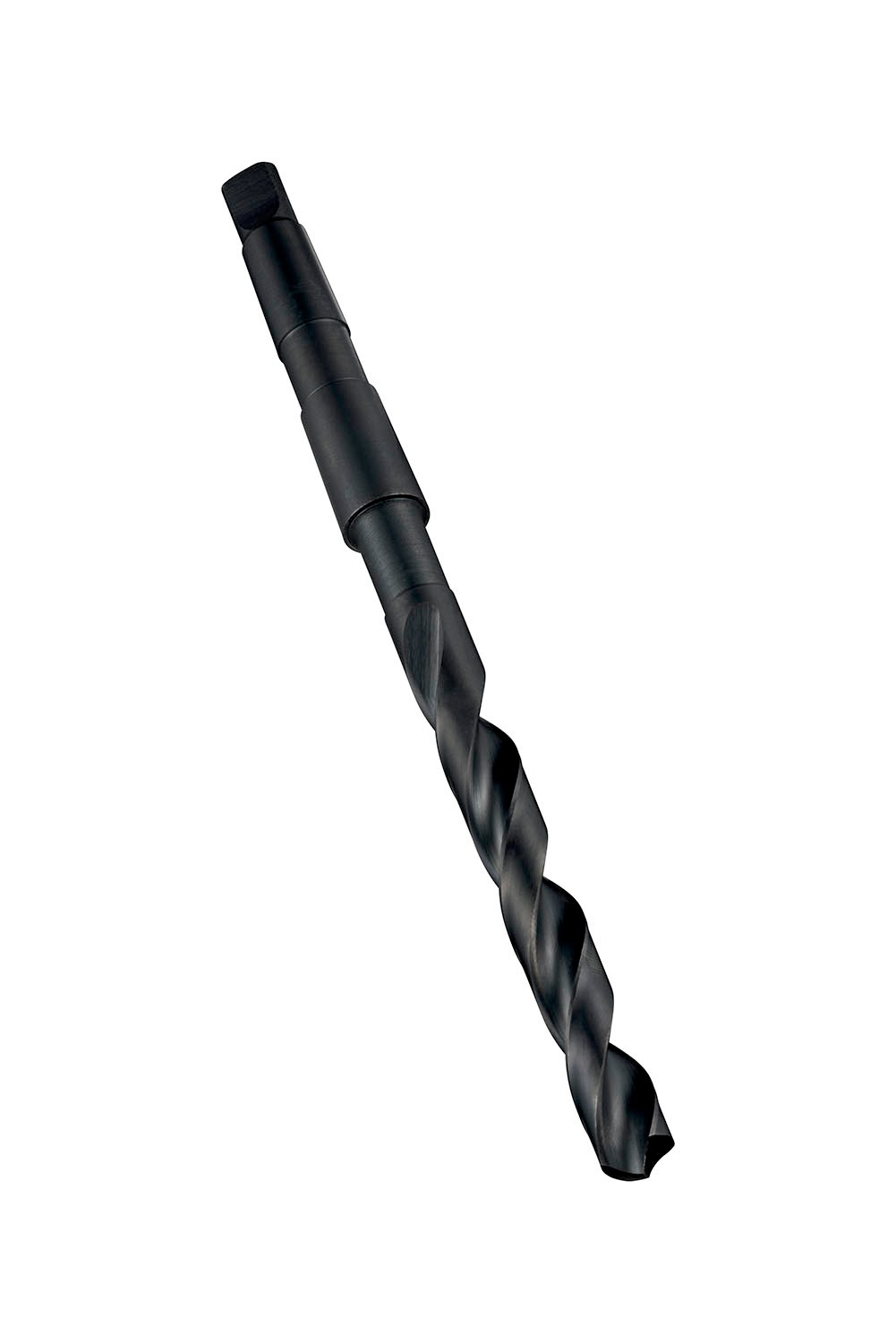 Jobber length drill with taper shank, diameter 1.5000″ (1.1/2) with an overall length of 349mm and flute length of 200mm according to DIN 345 standard with 118° thinned conical point, HSS with steam tempered finish for 4xD drilling without pecking in steel
