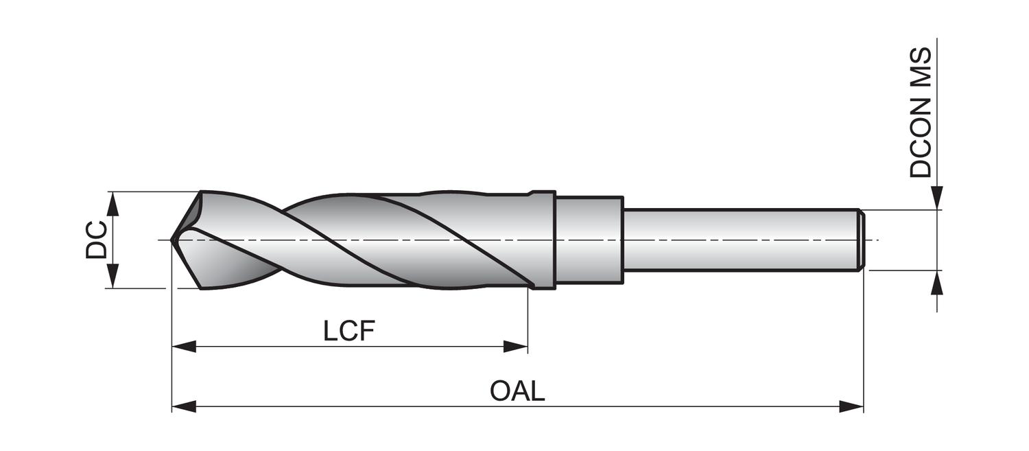 Standard length drill with 1/2″ reduced straight shank, diameter 0.5625″ (9/16) with an overall length of 6″ and flute length of 3.1/8″ according to DORMER standard with 118° point angle, HSS with steam tempered finish for 4xD drilling without pecking in steel