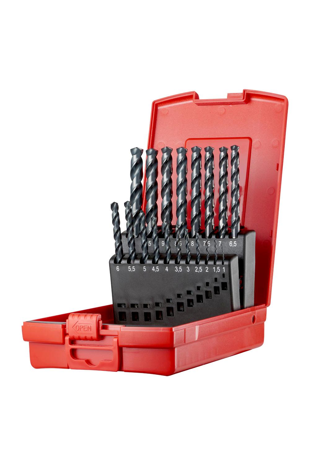 Drill set in standard plastic cassette consisting out of 19 jobber length drills with straight shank, A108 diameters 1.0 up to 10.0mm in increments of 0.5mm, according to DIN 338 standard with 135° split point, HSS with steam tempered finish for 4xD drilling without pecking in stainless steel (above 1.6mm with conical point)