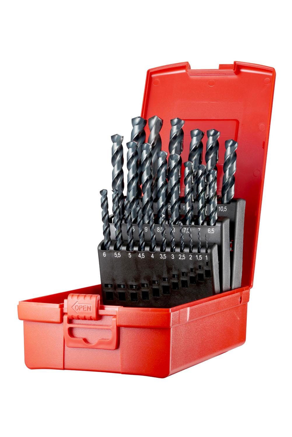 Drill set in standard plastic cassette consisting out of 25 jobber length drills with straight shank, A108 diameters 1.0 up to 13.0mm in increments of 0.5mm, according to DIN 338 standard with 135° split point, HSS with steam tempered finish for 4xD drilling without pecking in stainless steel (above 1.6mm with conical point)