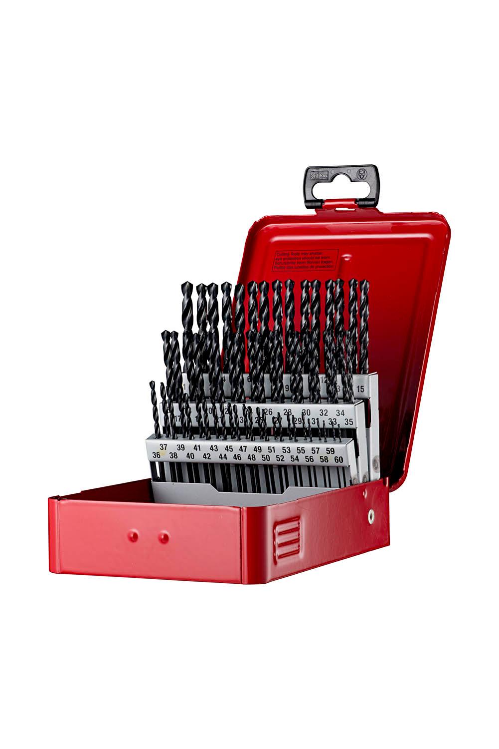 Drill set in standard plastic cassette consisting out of 60 jobber length drills with straight shank, A100 wire gauge sizes N60 up to N1, according to DIN 338 standard with 118° conical point, HSS with steam tempered finish for 4xD drilling without pecking in steel