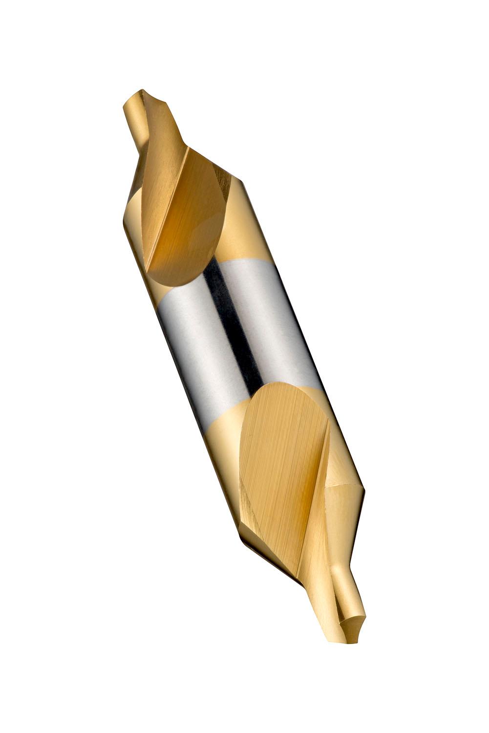 Centre drill (combined drill and countersink) with 60° straight conical form, double ended and cylindrical body, 2.50mm drill diameter, a body diameter of 6.30mm and an overall length of 45mm, according to DIN 333A standard to produce standardized centre holes according DIN 332 part 1 form A, HSS and TiN coating for machining free machining, plain carbon and alloy steel and grey cast-iron