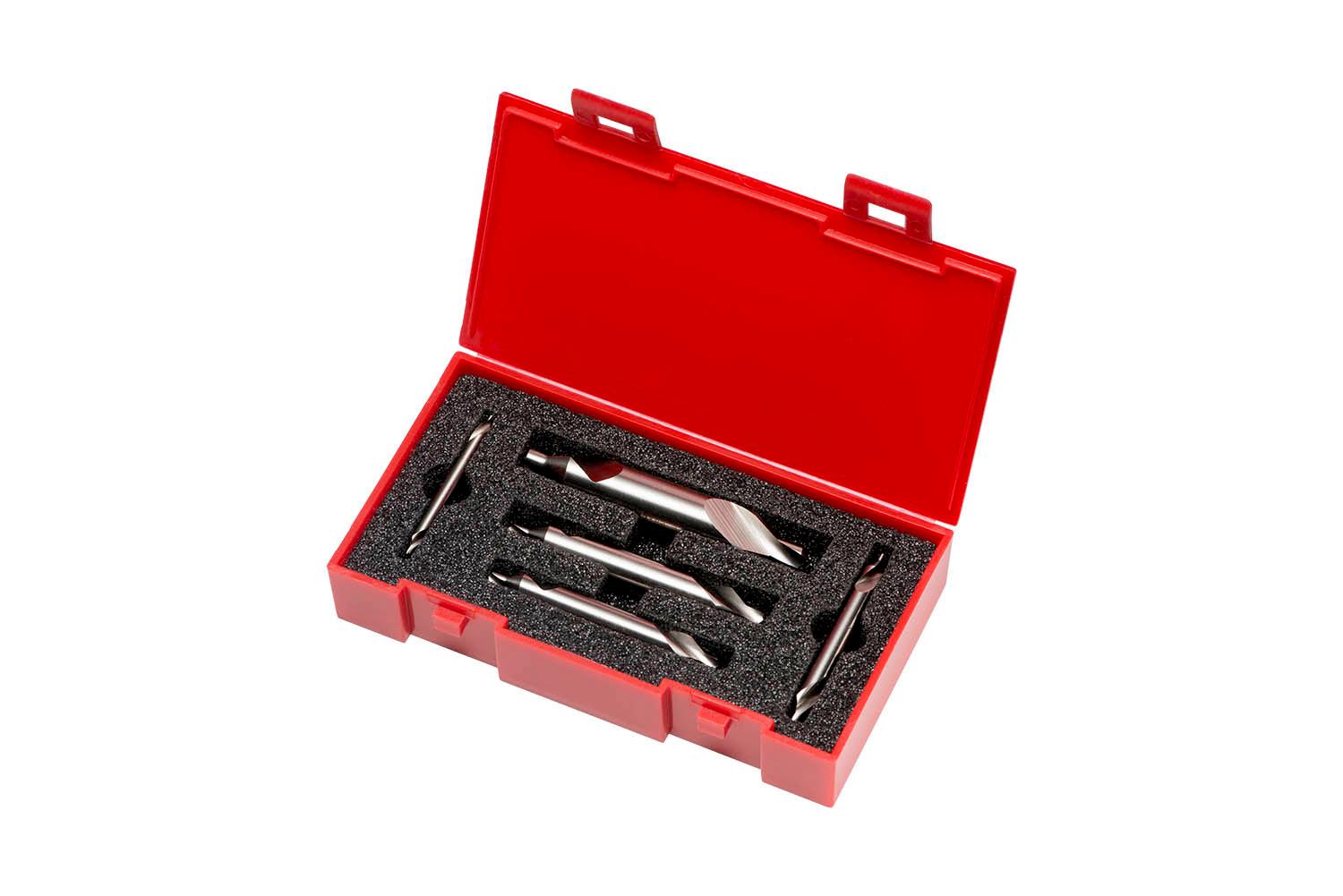 Centre drill set in plastic box consisting out of 5 A225 centre drlls with a 60° straight conical form, double ended and cylindrical body, sizes BS1 to BS5, according to BS 328 standard to produce form A centre holes, HSS and bright finish for machining free machining, plain carbon and alloy steel and grey cast-iron