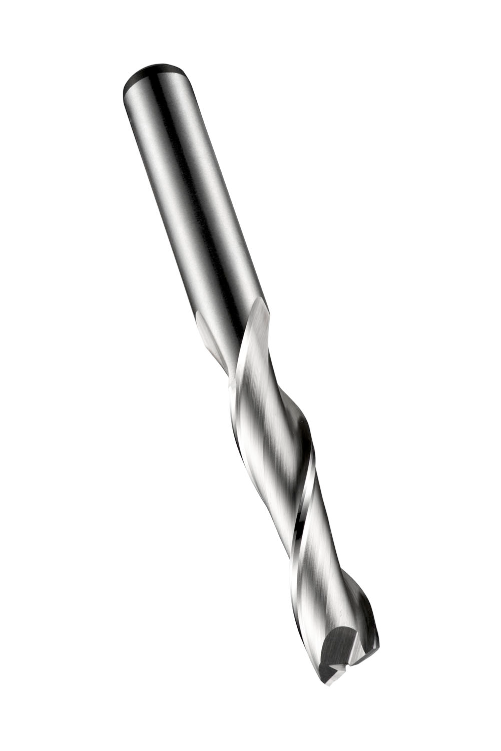 Long series end mill with 2 flutes, diameter 8mm with 33mm length of cut and 85mm overall length, according to DORMER standard with a 8mm plain shank, cobalt based HSS-E with bright finish, 30° helix and 12° rake angle for shoulder milling and slot milling in free machining steel and copper or copper alloys