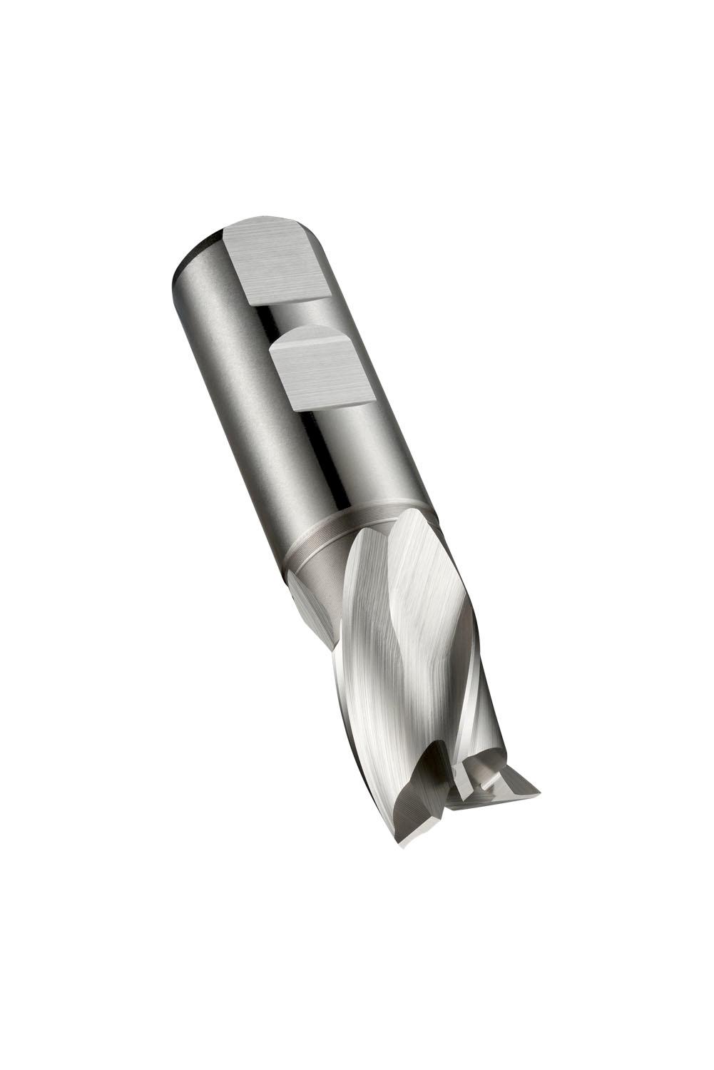 Extra short series slot drill with 3 flutes, diameter 25mm with 26mm length of cut, 102mm overall length and 45.5mm reach with neck relief, according to DIN 327 D standard with a 25mm Weldon shank, powder metallurgical HSS-E with bright finish, 30° helix and 12° rake angle for shoulder milling, slot milling and ramping in free machining and plain carbon steel and copper or copper alloys