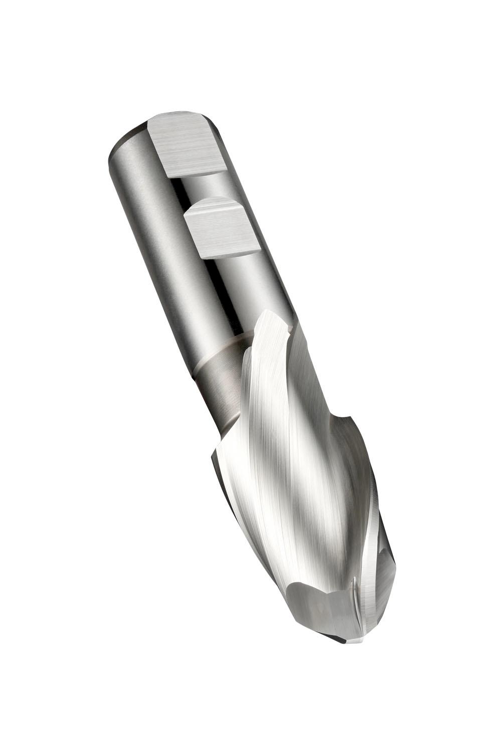 Short series ball-nose end mill with 2 flutes, diameter 30mm with 45mm length of cut, 121mm overall length, 64.5mm reach with neck relief and 15mm full profile radius, according to DIN 844 K standard with a 25mm Weldon shank, cobalt based HSS-E with bright finish, 30° helix and 12° rake angle for copy milling in free machining steel and copper or copper alloys