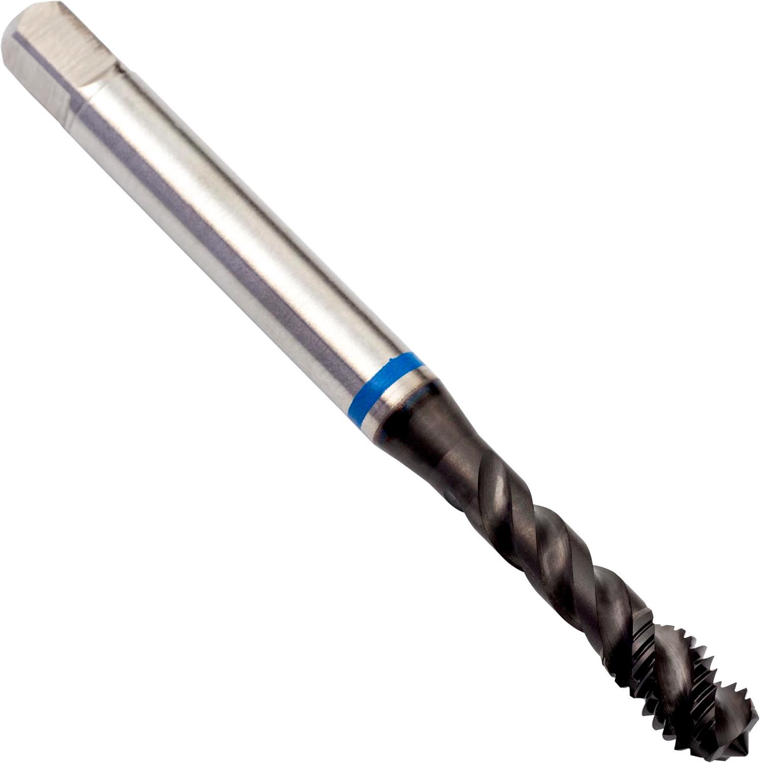 Spiral flute tap Blue Shark with chamfer form C with a 2-3xP plug lead, for ISO-Metric thread M6 with 1.00 mm pitch and 6H class of fit, dimensions according to DIN 371 standard with 6.0mm shank and 4.9mm square drive, powder metallurgical HSS-E with Super-B coating and 48° helix angle for 3xD blind hole threading in ferritic, martensitic and austenitic stainless steel