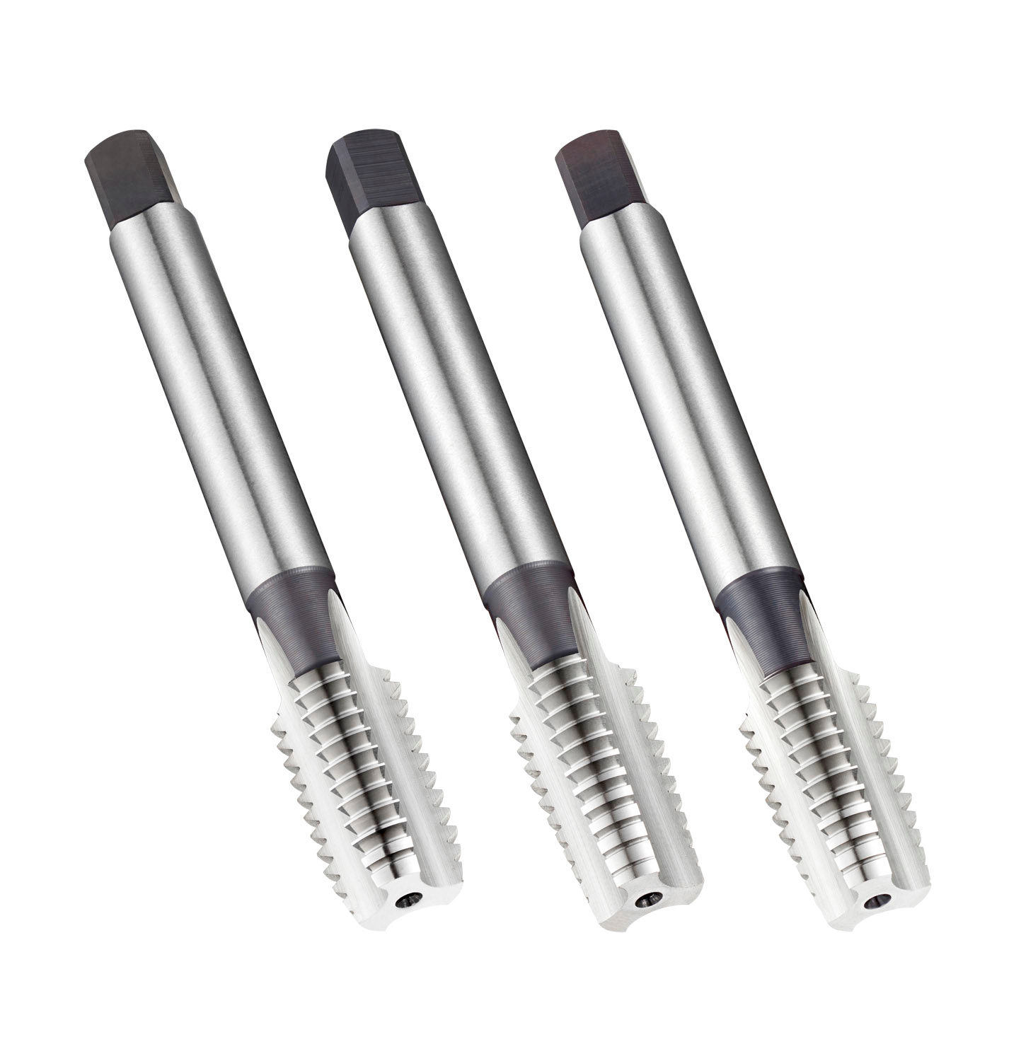 Set of straight flute hand taps NO6 for Unified National Coarse thread UNC 4 with 40 TPI and 2B class of fit, consisting of 1 tap with a 6-8xP taper lead, 1 tap with a 4-6xP second lead and 1 tap with a 2-3xP plug lead, dimensions according to ISO 529 standard with 3.15mm shank and 2.5mm square drive, HSS with bright finish for 1.5xD through or blind hole threading in free machining steel and copper or copper alloys