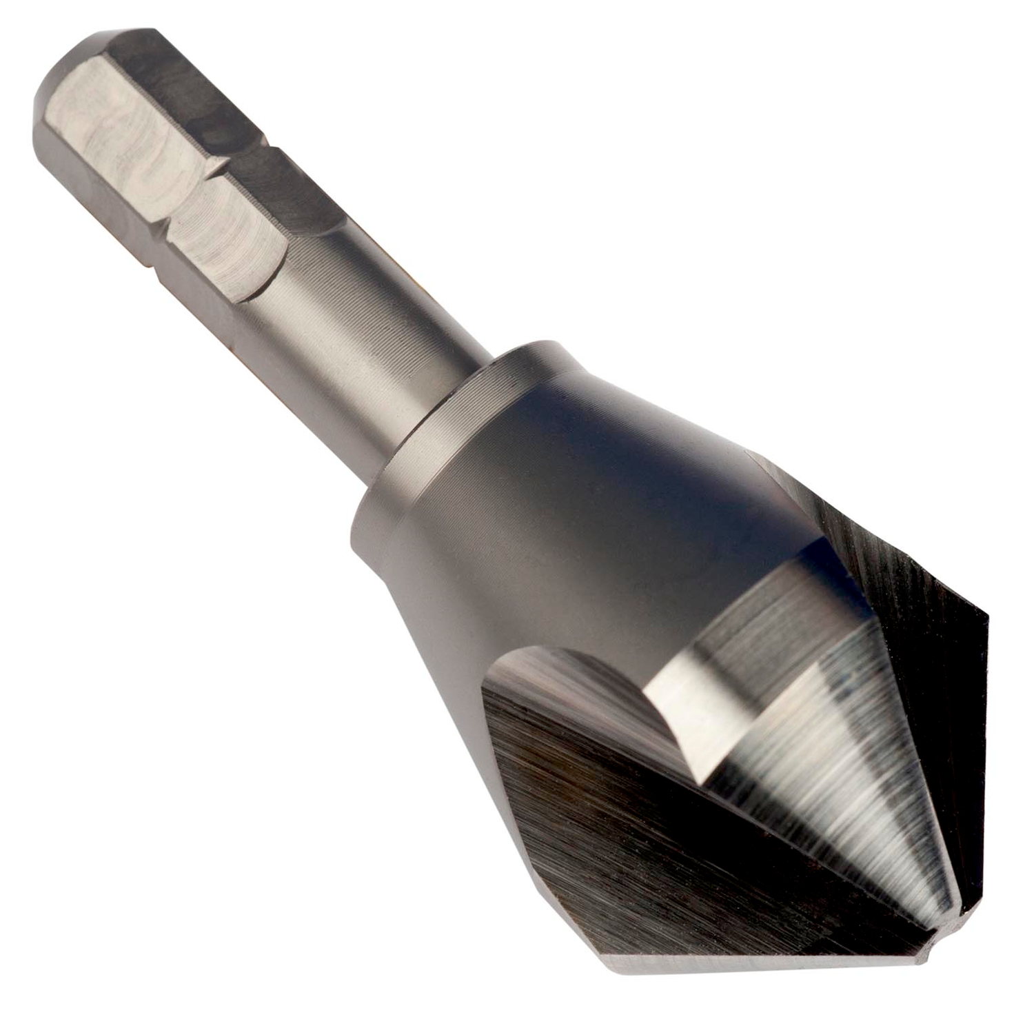 Countersink with 3-flutes, 90° chamfering angle, maximum diameter 10.40mm with an overall length of 50mm and 1/4″ hexagon drive, according to DORMER standard to produce a conical seat for ISO Metric countersunk-head screws with a minium hole diameter of 2.50mm, cobalt based HSS-E with standard bright finish for machining steel and cast steel, copper or copper alloys
