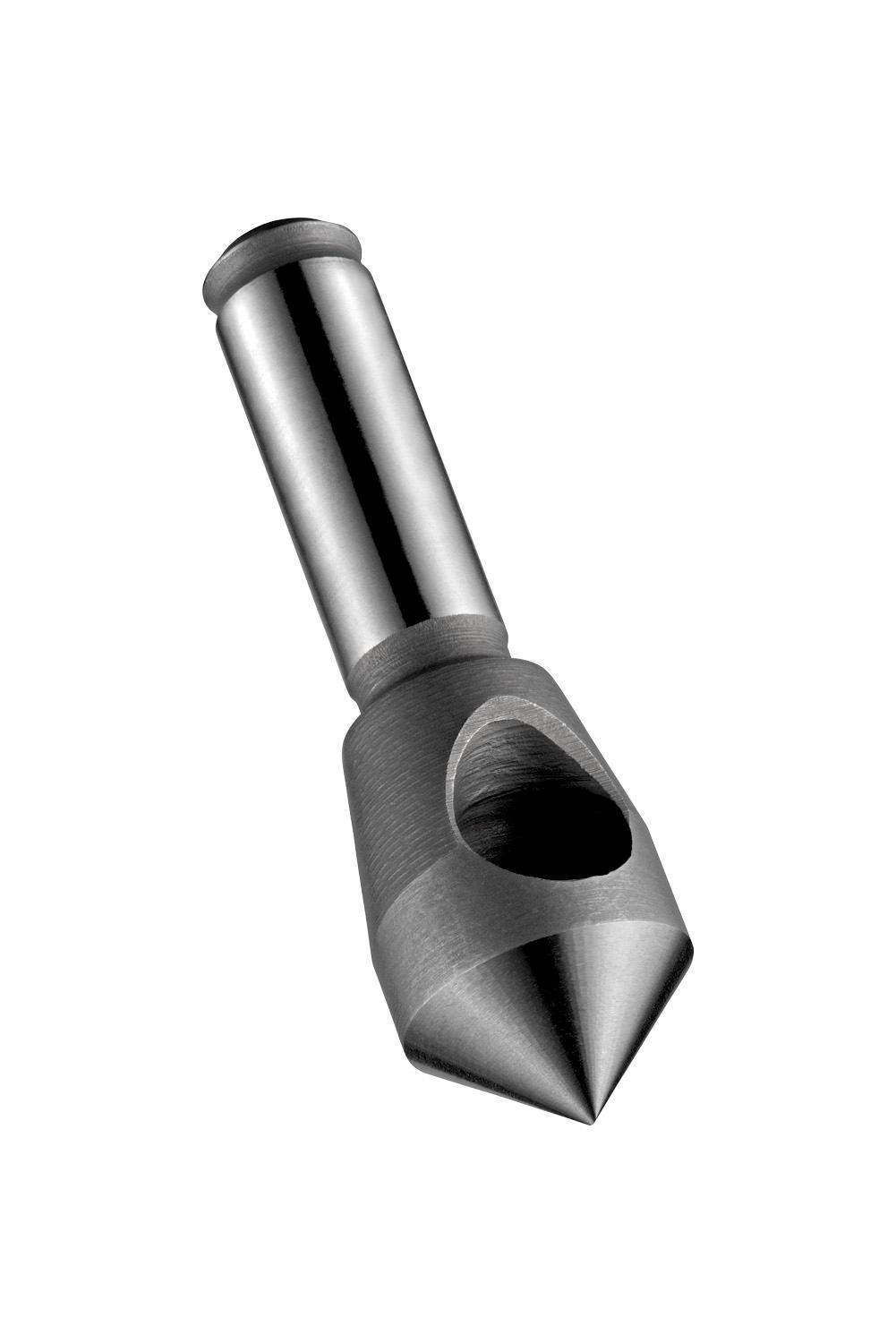 Zero flute countersink, through hole style, with 1-cutting edge, 90° chamfering angle, maximum diameter 25.00mm with an overall length of 102mm and a head length of 48mm and 15mm straight shank, according to DORMER standard to produce a conical seat for ISO Metric countersunk-head screws with a minium hole diameter of 20.00mm, cobalt based HSS-E with standard bright finish for machining free machining, plain carbon and alloy steel, wrought and copper or copper alloys