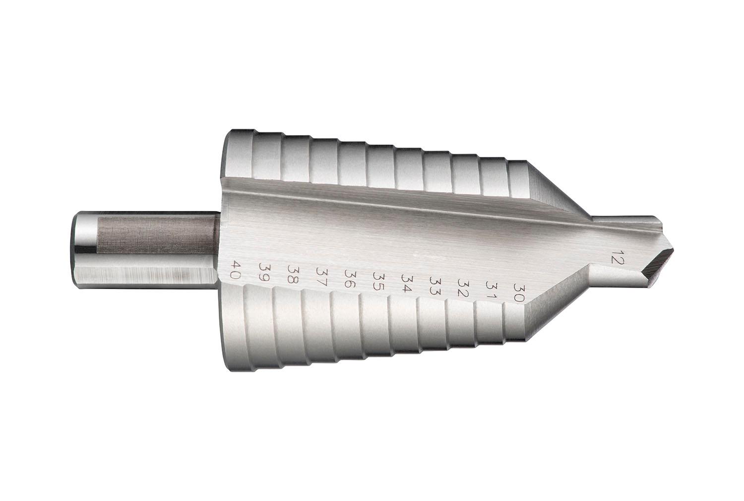 Multi diameter step drill for sheet metal with, diameter range 30.0 to 40mm in steps of 1.0mm and 13mm straight shank, according to DORMER standard, HSS with standard bright finish for machining free machining steel, wrought and copper or copper alloys and polymers