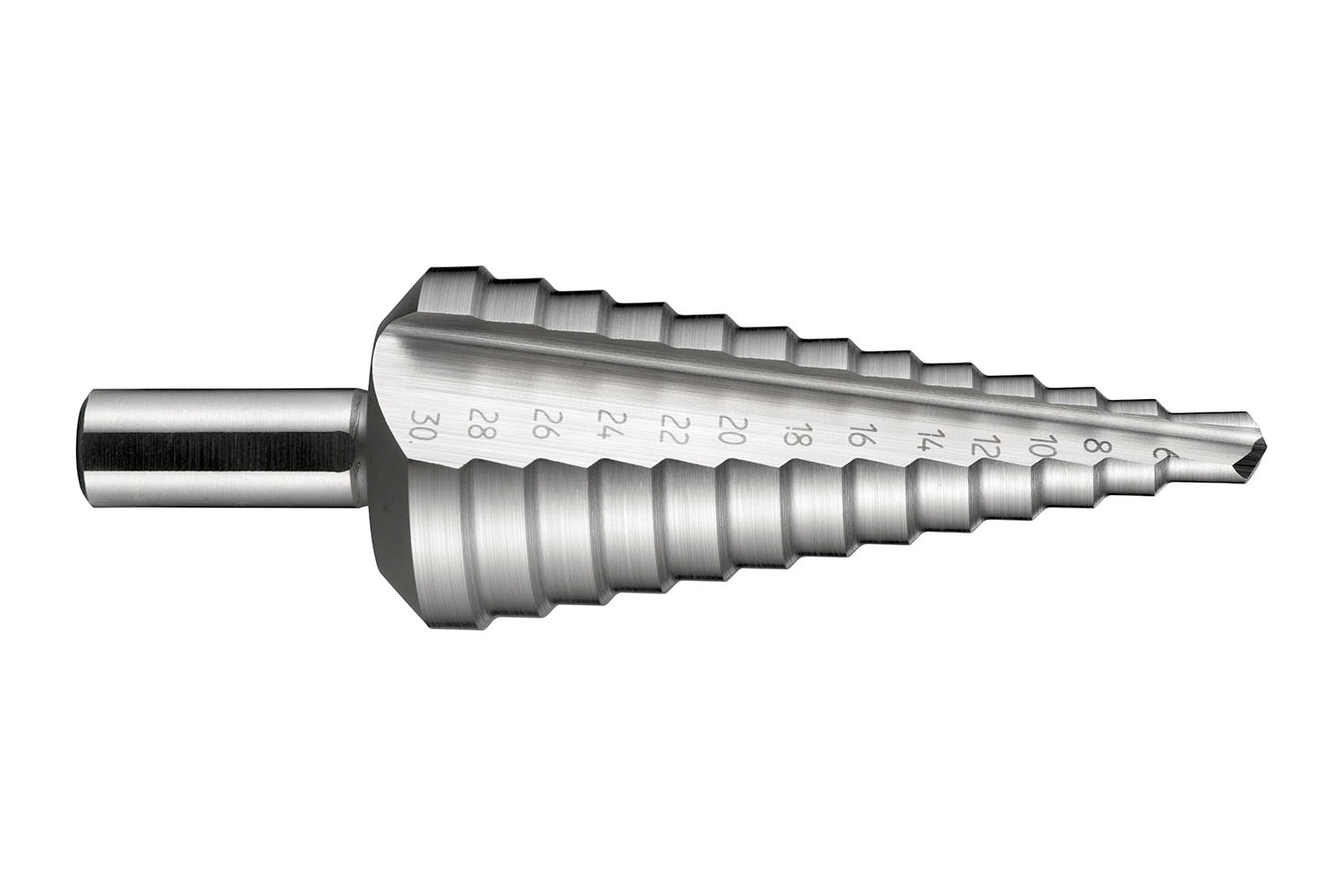 Multi diameter step drill for sheet metal with, diameter range 6.0 to 30mm in steps of 2.0mm and 10mm straight shank, according to DORMER standard, HSS with standard bright finish for machining free machining steel, wrought and copper or copper alloys and polymers