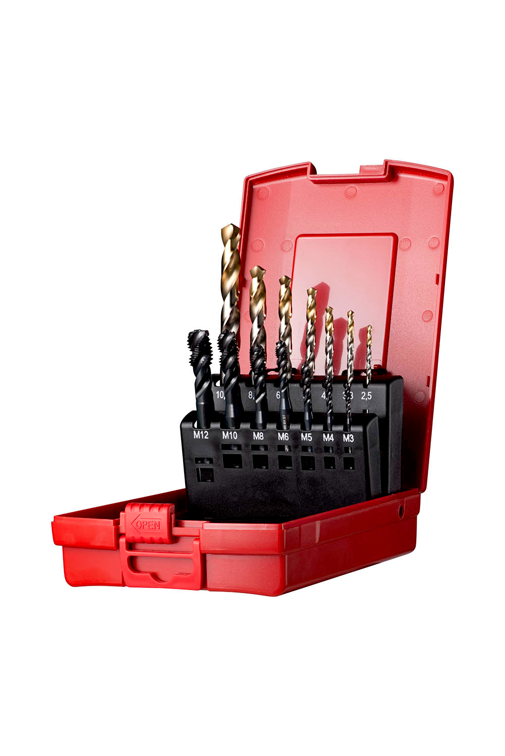 Drill + tap set Nr.204 ( 14 Pcs ) in standard plastic cassette to produce ISO- Metric threads from M3 up to M12, consisting of 7 HSS-E-PM steam tempered spiral flute tap E003 with chamfer form C with a 2-3xP plug lead, 7 HSS TiN-tip coated jobber length drills with straight shank A002 for the recommended pre-machined hole diameters for 2.5xD blind hole threading in general purpose applications