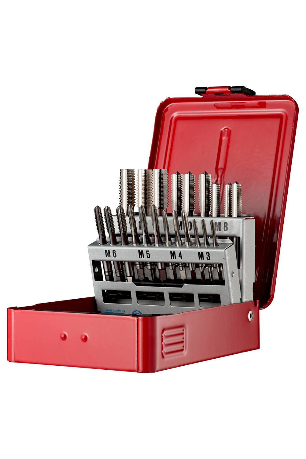 Tap set Nr.17 ( 21 Pcs ) in metal cassette to produce ISO- Metric threads from M3 up to M12, consisting of 7 HSS bright finished straight flute serial tap E100-NO8 in sets of 3 each for 1.5xD through or blind hole threading in free machining and plain carbon steel and non-ferrous metals