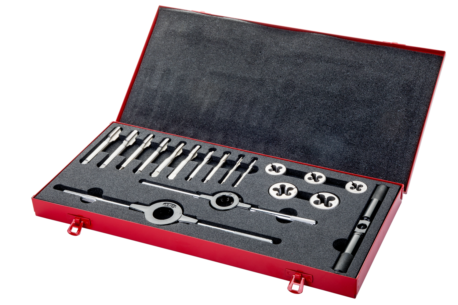 Threading set HS-24UNF ( 18 Pcs ) in metal cassette to produce Unified National Fine threads from UNF 1/4″ up to UNF 1/2″, consisting of 5 HSS bright finished straight flute hand tap E524-NO1 with a 6-8xP taper lead, 5 HSS bright finished straight flute hand taps E524-NO3 with a 2-3xP plug lead, 5 HSS bright finished adjustable circular split dies F330, 1 straight handle tap wrench L112 for taps with a square drive within a range from 1 up to 10mm and 2 straight handle die stocks L110 for dies with an outside diameter and thickness within a range from 1×3/8 up to 1.5/16×7/16″ for 1.5xD through or blind hole threading in free machining and plain carbon steel and copper or copper alloys