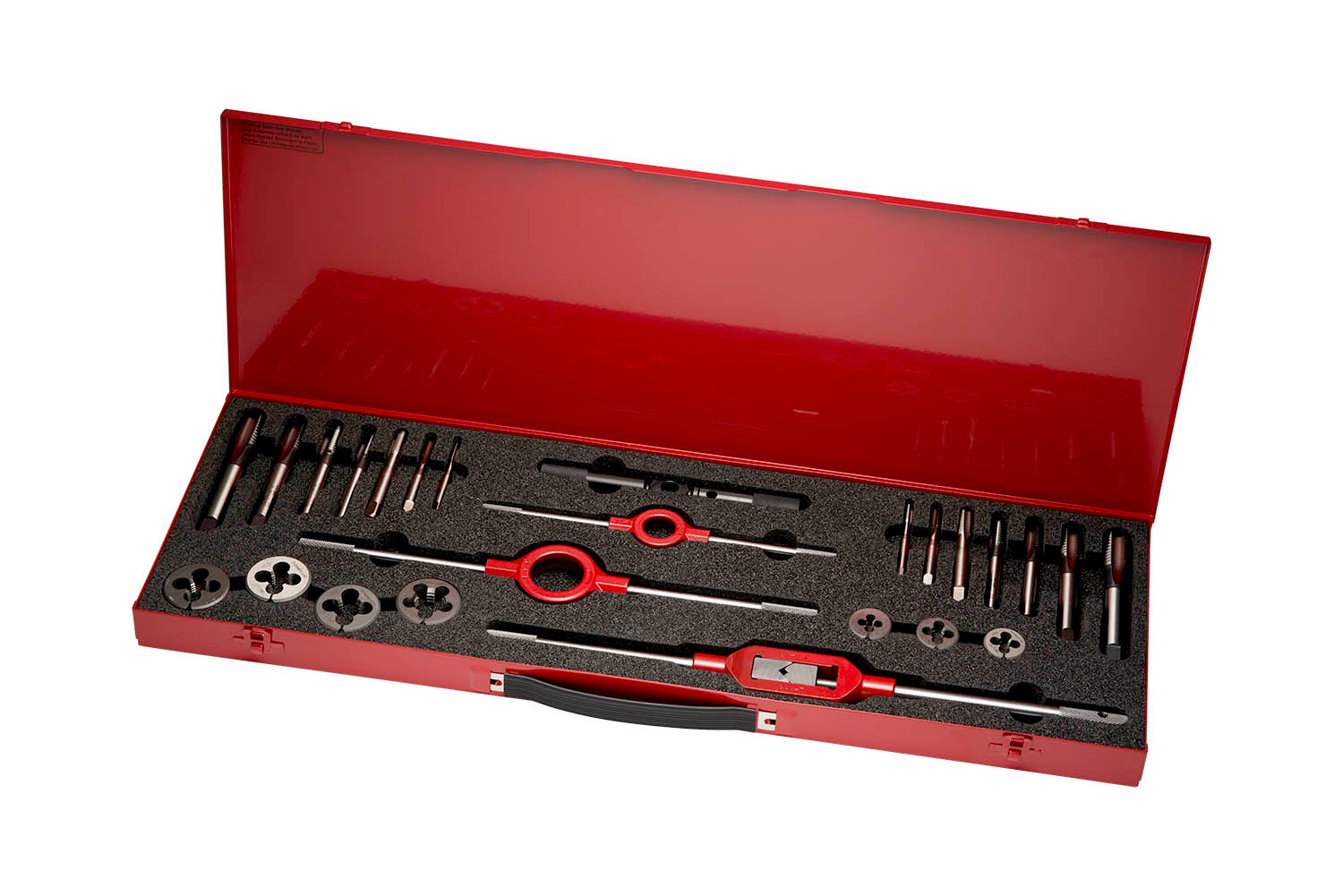 Threading set HS-32UNC ( 27 Pcs ) in metal cassette to produce Unified National Coarse threads from UNC 1/4″ up to UNC 3/4″, consisting of 7 HSS bright finished straight flute hand tap E515-NO1 with a 6-8xP taper lead, 7 HSS bright finished straight flute hand taps E515-NO3 with a 2-3xP plug lead, 9 HSS bright finished adjustable circular split dies F320, 2 straight handle tap wrenches L112 for taps with a square drive within a range from 1 up to 12mm and 2 straight handle die stocks L110 for dies with an outside diameter and thickness within a range from 1×3/8 up to 1.1/2×1/2″ for 1.5xD through or blind hole threading in free machining steel and copper or copper alloys